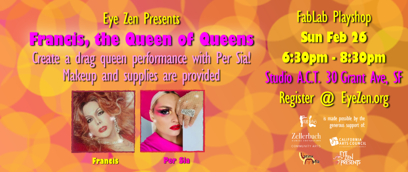 Join this empowering event celebrating the art and drag of queer ancestor Francis, the Queen of Queens. Inspired by Francis’ talents in drag, comedy, and multi-disciplinary arts, attendees will explore their multi-disciplinary artistry and develop a drag persona. Teaching artist and San Francisco’s most beloved drag queen Per Sia will lead participants in this playshop. Come with ‘an open heart’ and have fun! Makeup and supplies will be provided.
