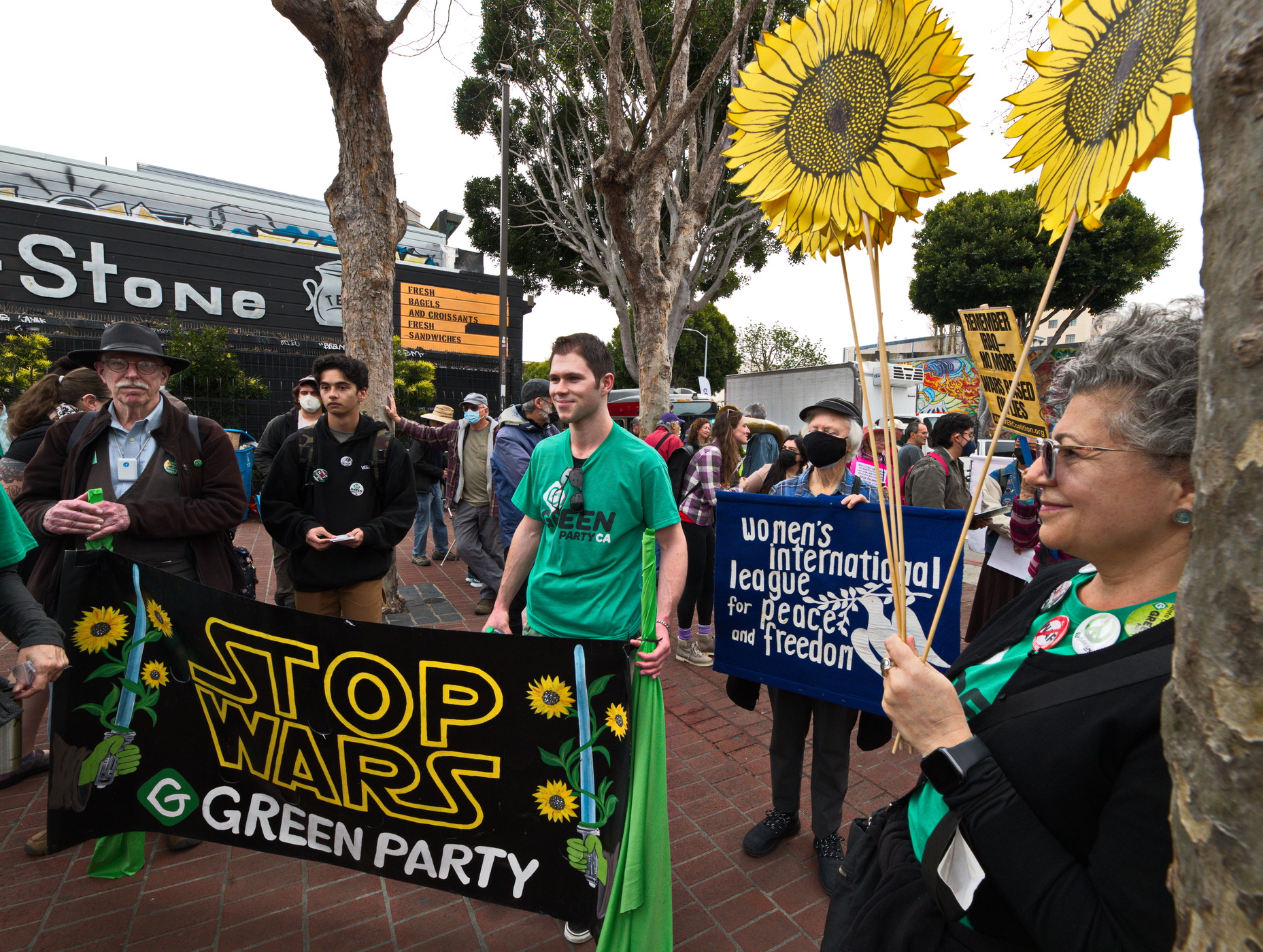 On Saturday, Answer Coalition and many other anti-war organizations held a demonstration and march at Mission and 24th Street. Sharing the space with street vendors and a couple of unhoused people, banners and signs proclaimed demands for peace in Ukraine, abolishing NATO, the diversion of taxpayers' money to meet human needs and the end of US aggression toward Cuba, Haiti and the usual "enemies" in South America and Africa. There were signs declaring that our latest opponent, brand new for this season, China, is not "our" enemy.Ukrainian counter-protesters were there and, having been invaded by Russia and resisting, showed considerably less interest in peace. Along with signs asking for war planes and long range missiles, a sign said "Peace with Russia is Genocide." They displayed a Ukrainian flag emblazoned with Ukraine's patron saint, Saint Olga of Kyiv, holding an anti-tank missile launcher.