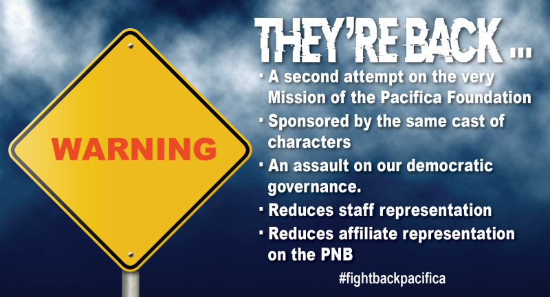 Pacifica and the stations are in danger. The Pacifica National Board and lawyer Arthur Schwartz have voted illegally to keep themselves on the Pacifica National Board in violation of a 6 year term limit. They are illegally voting to sell the KPFK station property without proper oversight and to keep it a secret even from the KPFK Local station board. They have also attempted to remove those members who are following the bylaws.