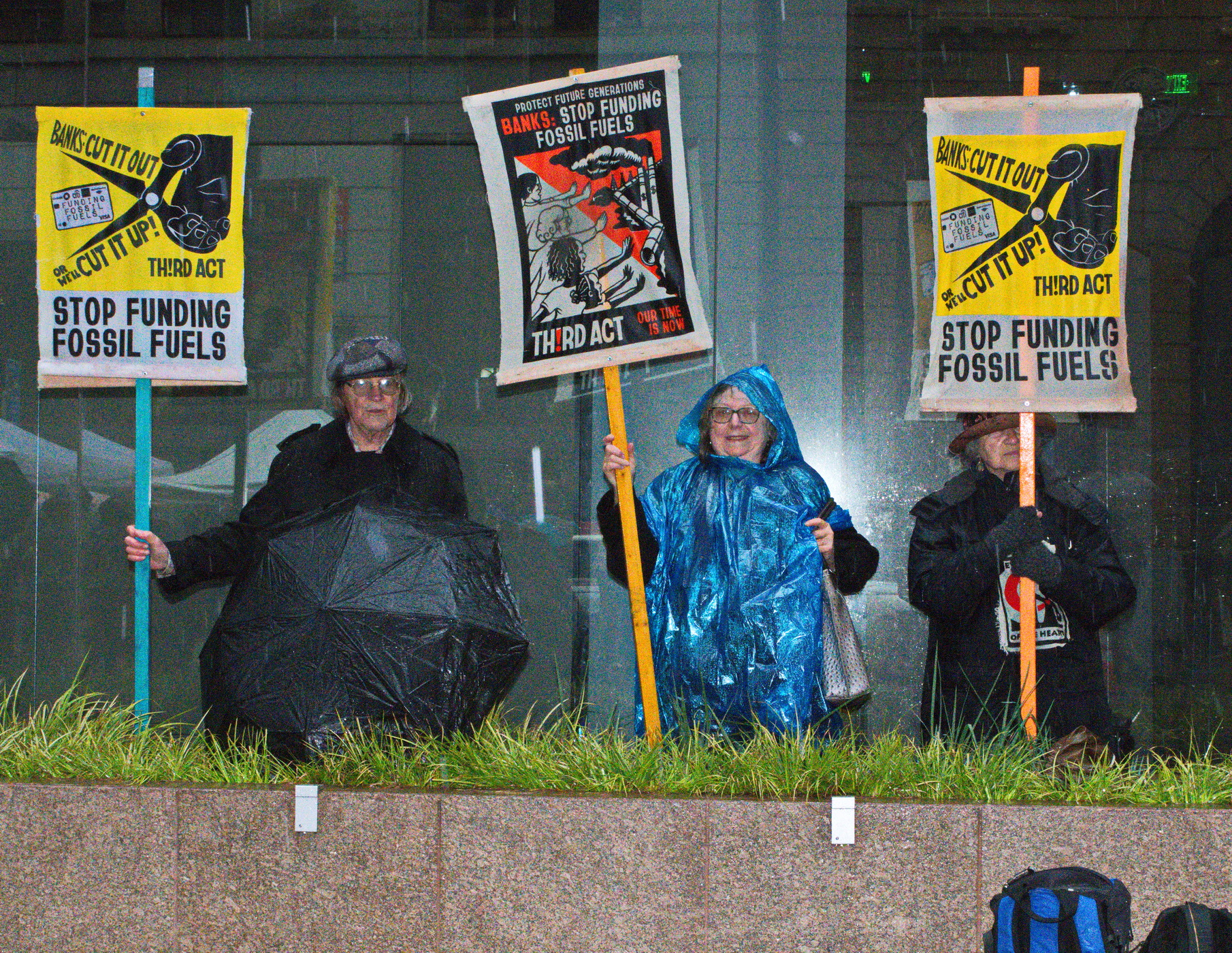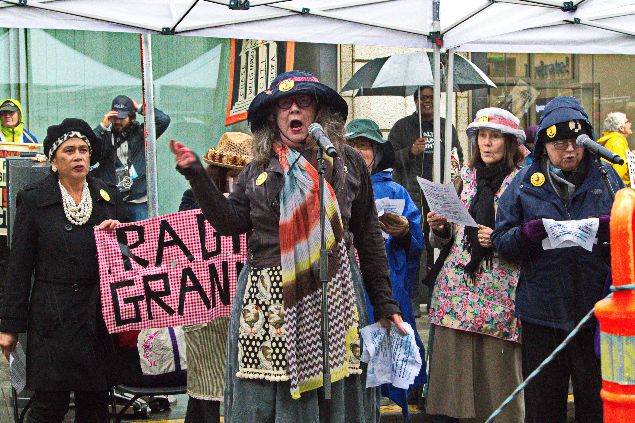 March 21. Once again, Wells Fargo Bank on San Francisco's Montgomery was the scene of an environmental protest. This time sponsored by "Th!rd Act", seniors that join the youth that is leading environmental activism worldwide.The extreme weather drove home the point of environmental chaos caused by fossil fuels. In the midst of yet another atmospheric river, extreme winds were disrupting the Bay Area. Overturned big rigs blocked the Bay Bridge, the Golden Gate Ferry was cancelled due to high winds and windows were being sucked off of buildings. Closed streets gridlocked the downtown.