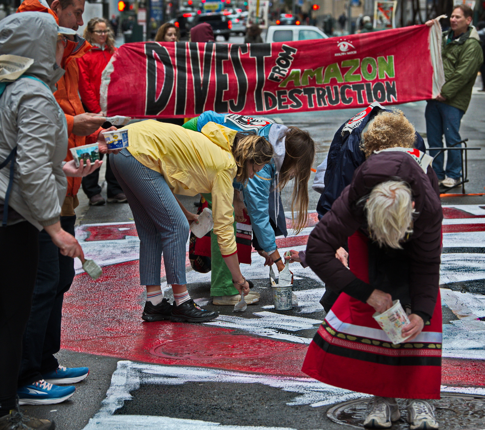 In the midst of the unusual storm, in rain gear and umbrellas, activists chained themselves to the Wells Fargo World Headquarters doors and ceremoniously cut up their credit cards. A huge banner - redundantly, proclaimed the climate emergency. Posters pasted to Wells Fargo's window demanded that the bank stop funding fossil fuels. A huge mural designed by David Solnit was painted on the blocked off street.