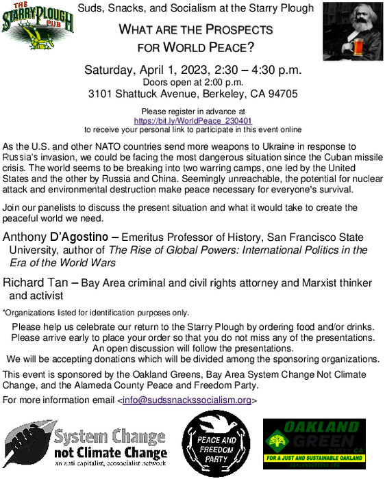 This event is sponsored by the Oakland Greens, Bay Area System Change Not Climate Change, and the Alameda County Peace and Freedom Party.