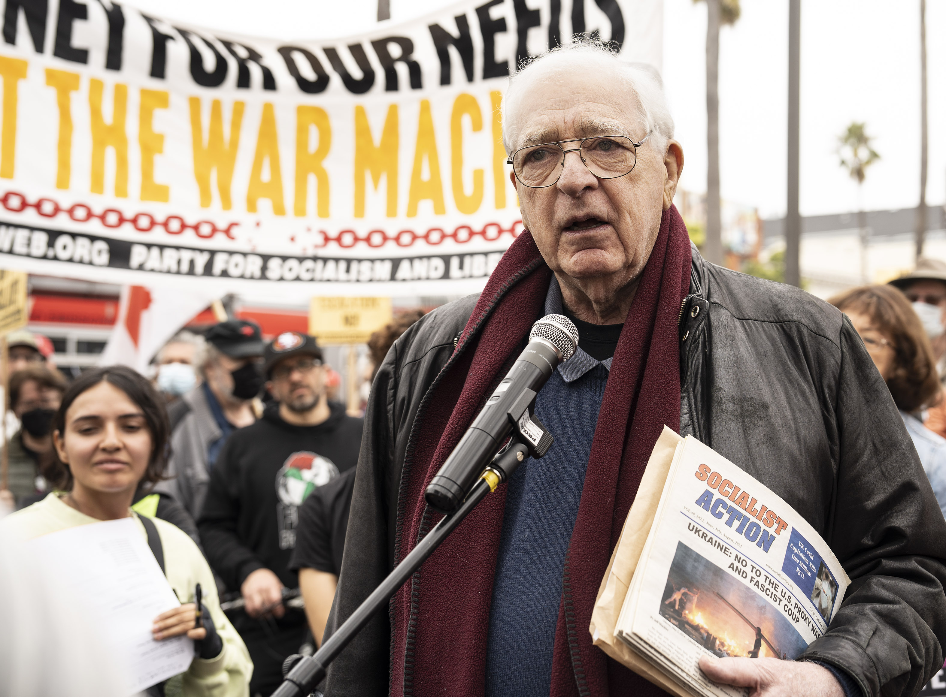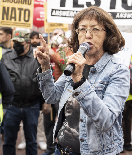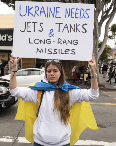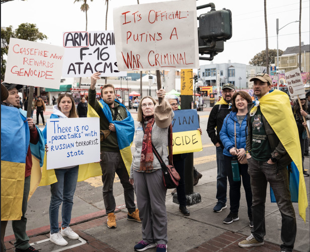 A handful of counter demonstrators tried without success to outshout the powerfully amplified demonstration. Their signs said Russians are committing genocide and called for more weapons for Ukraine.