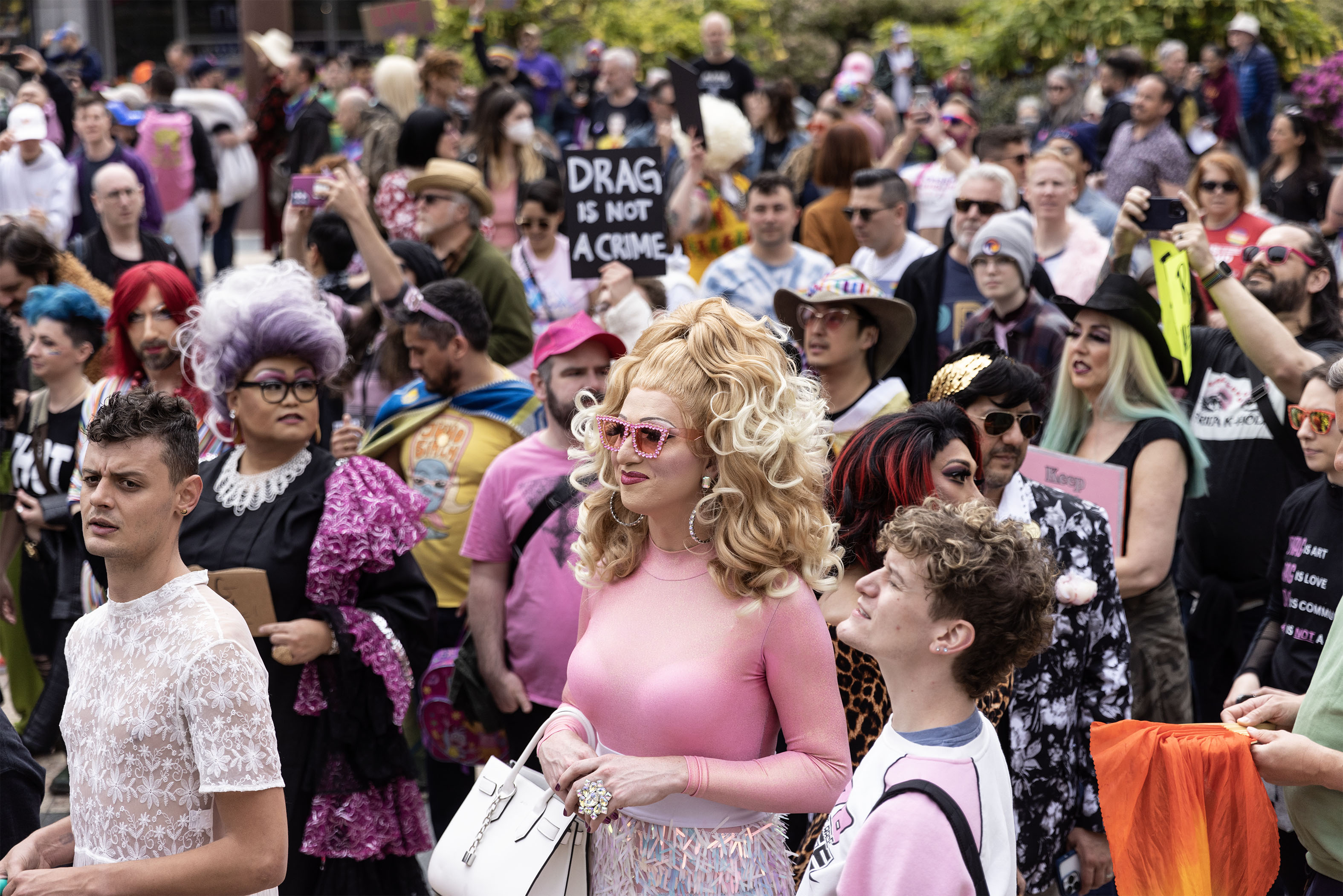 Psychedelic colored wigs and glamorous gowns were the order of the day and it was hard to proclaim one drag queen the best until another one appeared to take the cake. Folks in solidarity with the trans/queer/drag cause carried signs of support and some donned large rainbow flag colored sunglasses.