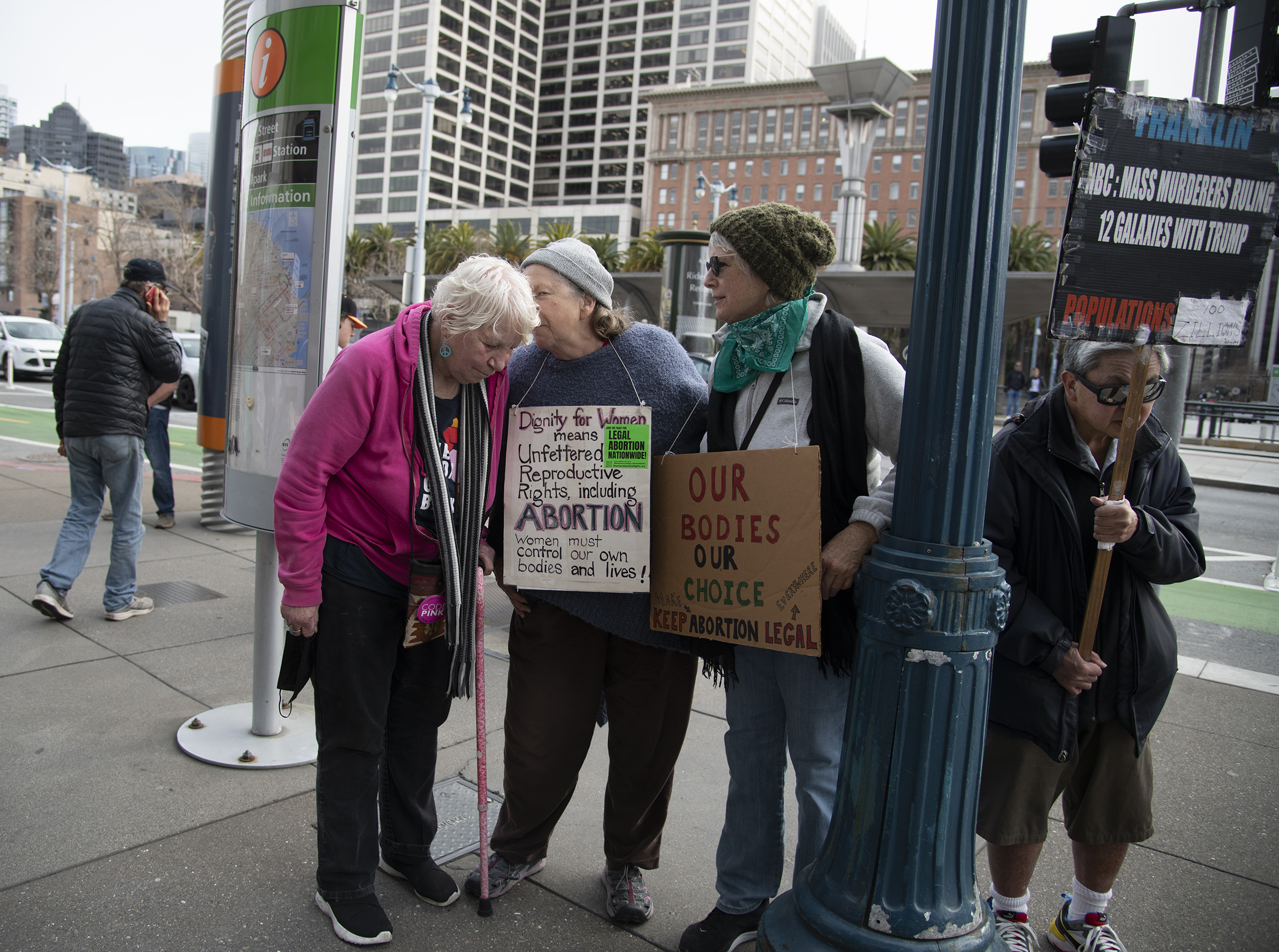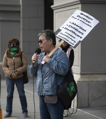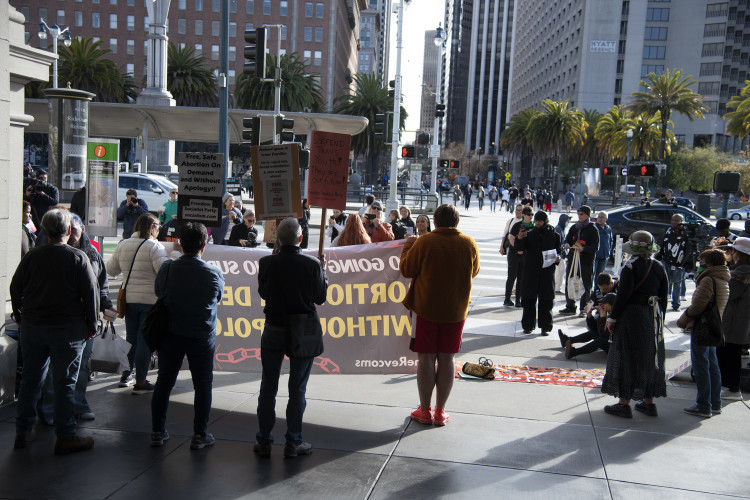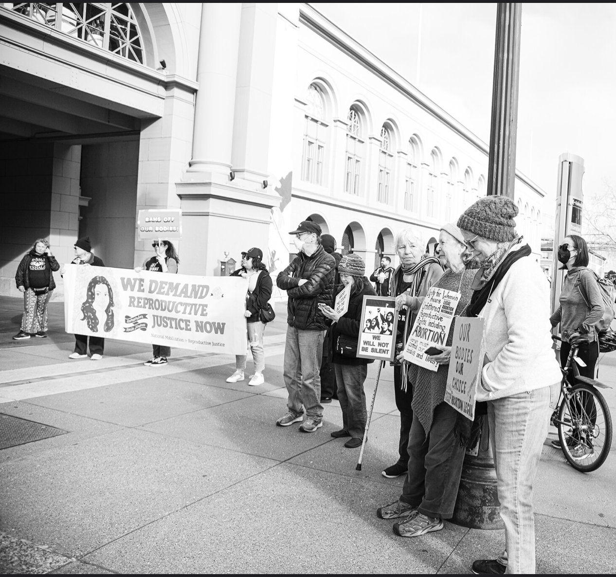 After a federal judge in Texas issued a ruling that could affect women throughout the US in their ability to receive reproductive healthcare, activists in San Francisco called for an emergency rally. Several young women who happened by joined in impromptu with great enthusiasm as well. They were on their way to a Giants game when they saw the large banners and people gathered in front of the Ferry Building. The Raging Grannies gave them hugs and high fives and encouraged them to share experiences at the mic.