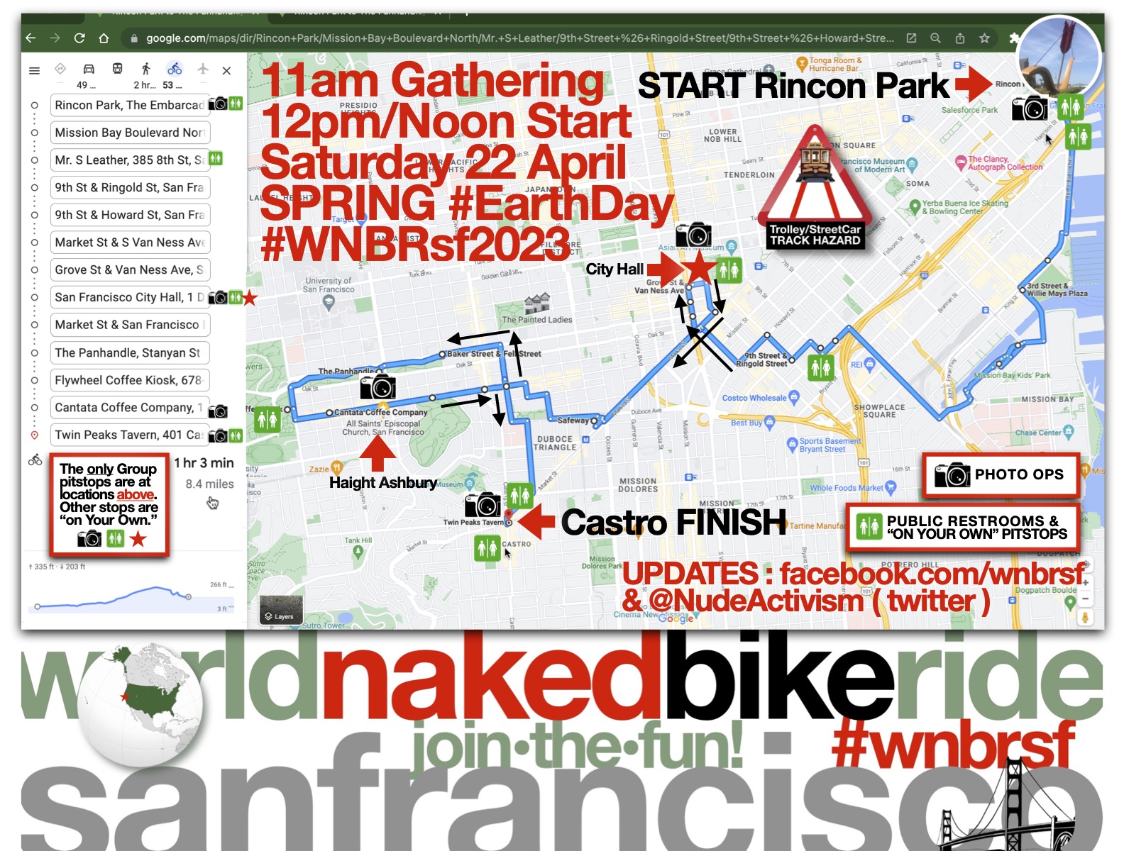 Final Route/Map for Saturday 22 April Spring #EarthDay #BareAsYouDare San Francisco World Naked Biker Ride ( #WNBRsf2023 ) Ride&afterParty patronizing local trailblazing ( like no place else on 🌎Earth🌍 ) “Nudist/Human Welcoming Merchants” in SanFrancisco🇺🇸USA.