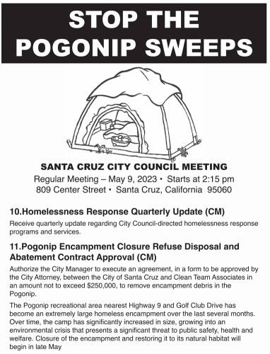 Tell the Mayor and City Council to stop the sweeps. There is no place for the hundreds living in the Pogonip to move. Provide trash pick up and toilets but don't force these people to move back into the doorways and river banks only to face late night tickets, fines and jail.