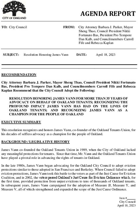 For those of you who may have missed this, last month on April 14, 2023, the Oakland City Council passed a resolution https://oakland.legistar.com/LegislationDetail.aspx?ID=6054630&GUID=45C2A13B-DE86-4281-9379-003D2CE63F61&Options=&Search to honor longtime tenant activist James E. Vann, declaring April 18, 2023 as James Vann day in Oakland.