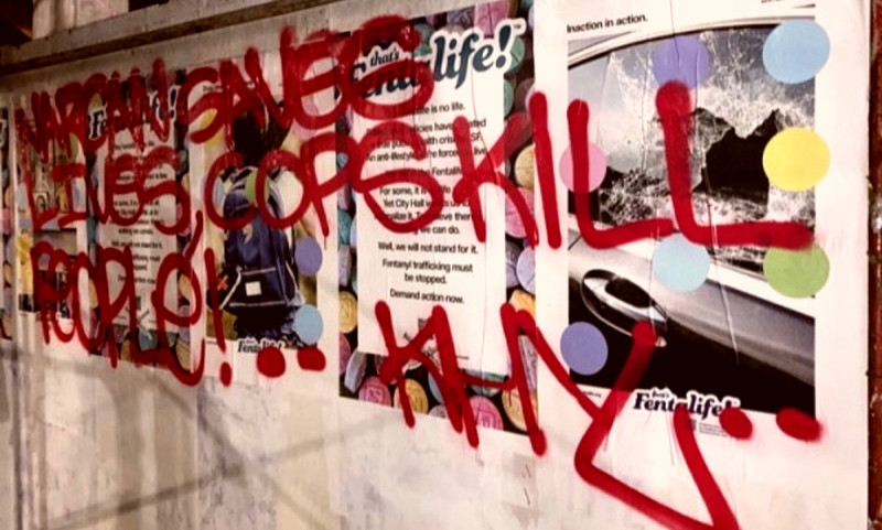 Graffiti reads, “Narcan Saves Lives, Cops Kill People!” “Fuck Your Fascists!” Source: Indybay.org