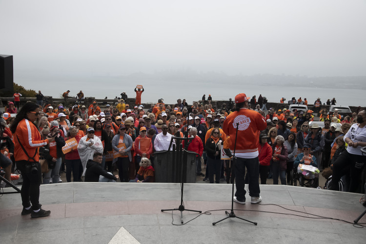 Local Bay Area group United Playaz always shows up to march and speak out. Their non-profit group works to provide youth with adult support, academic enrichment, and leadership skills to prevent them from entering and re-entering the justice system. This year once again they sported black and white t-shirts and sweatshirts with messages including "It takes the hood to save the hood." Members spoke from personal experience of gun violence horrors in the Bay Area.