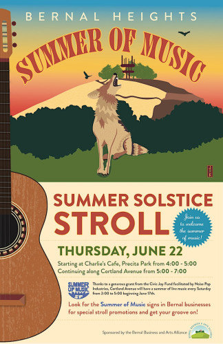 Join us for Bernal Heights annual Summer Solstice Stroll now featuring six live musical groups. Come shop, dine and dance along to Bernal Heights annual Summer Solstice Stroll, featuring live acoustic music including local jazz and folk artists.