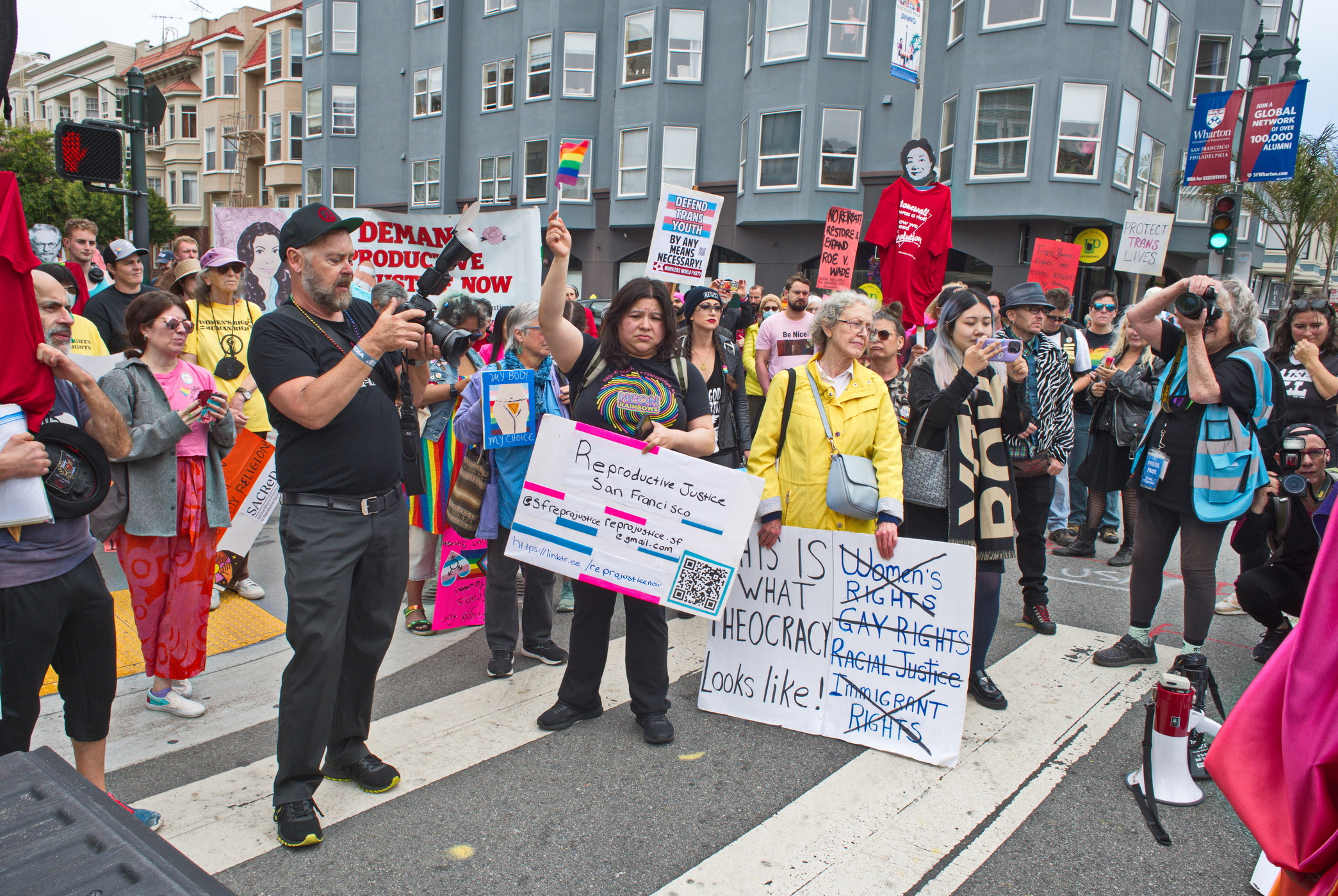Sunday, January 25. They gathered at the corner of Polk and Washington streets in San Francisco. Many groups were represented. The Freedom Socialist Party, The National Mobilization for Reproductive Justice, the Workers World Party, The UUSF Women's Rights Group, The Sisters of Perpetual Indulgence, and of course, the Raging Grannies.While noting the backlash against the progress in human rights by a proto fascist Republican party and a corrupt Supreme Court, speakers also spoke of the rising resistance from Starbucks, Amazon workers, and graduate students and many LGBTQ+ human rights organizations.
