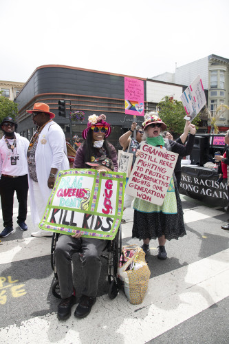 The parade contingent for reproductive justice was spearheaded by the National Mobilization for Reproductive Justice-San Francisco and joined by the the Raging Grannies Action League and members of the San Francisco Unitarian Universalist Church. Also marching under the banner "We Demand Reproductive Justice Now" were members of Radical Women and the Freedom Socialist Party. Others joined in the contingent because they were responding to the call by Women's March for action on the anniversary of the overturn of Roe v. Wade.
