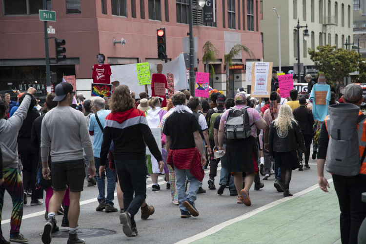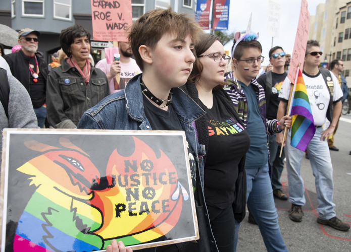 Reproductive rights activists joined a rally and march on site of the original 1970 Pride on June 25, forming a colorful and loud contingent. People gathered saying they were "ready for the fight" in front of the Cinch Saloon, a Polk Gulch neighborhood gay bar.