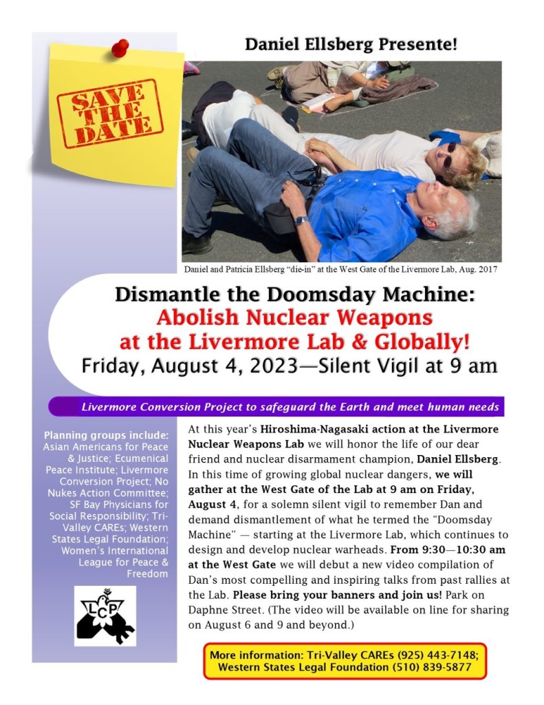 We will gather at the West Gate of the Lab at 9 am on Friday, August 4, for a solemn silent vigil to remember Dan and demand dismantlement of what he termed the “Doomsdav Machine” – starting at the Livermore Lab, which continues to design and develop new nuclear warheads.