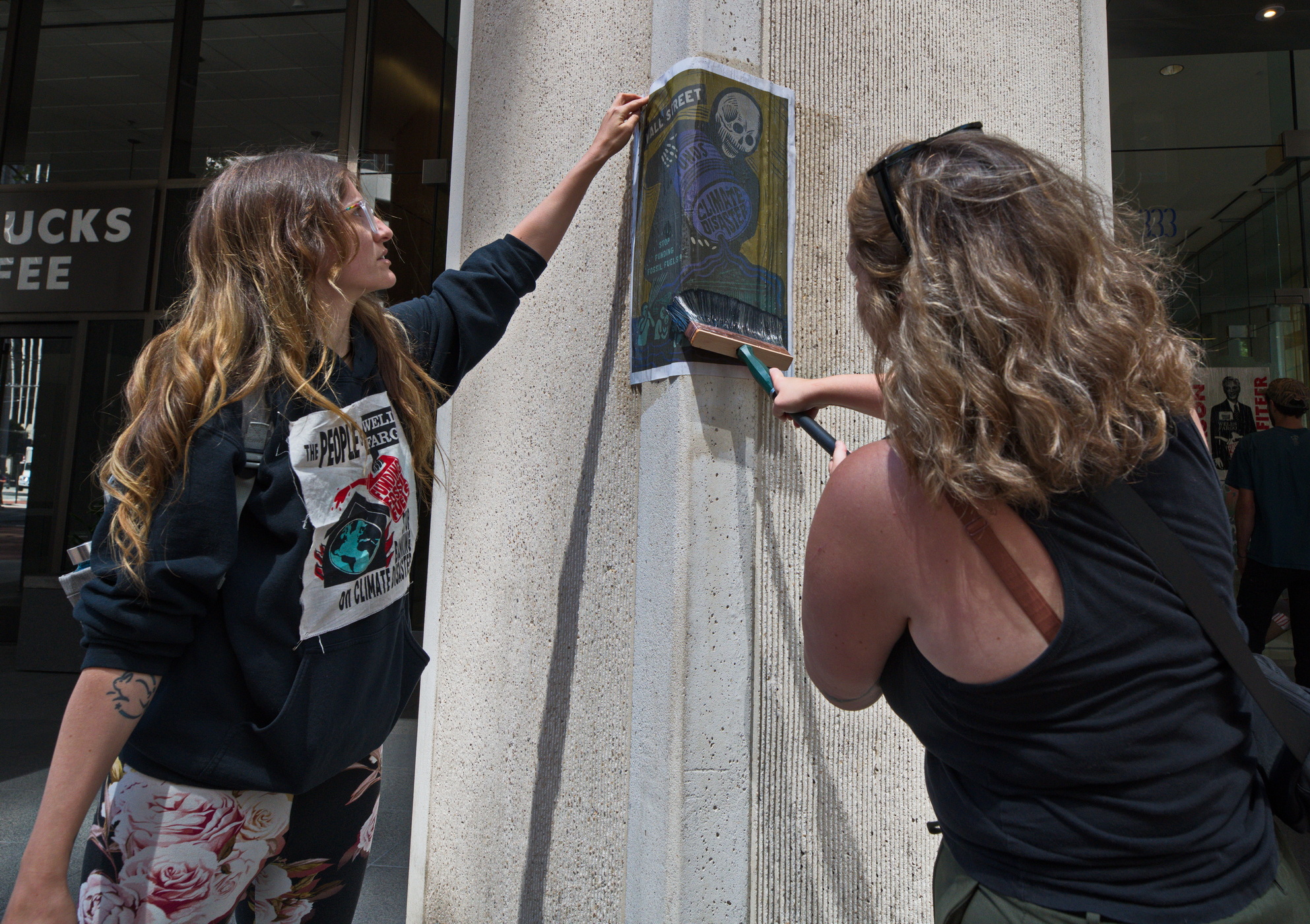 The "block party" featured speeches, food, games, and musical entertainment by the Raging Grannies. A large mural was painted on plaza's floor and posters were pasted throughout the area.