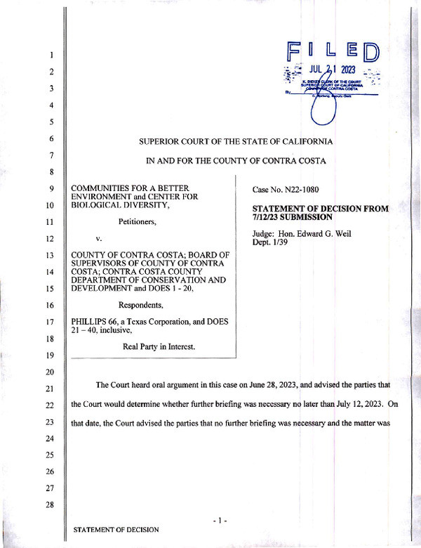 MARTINEZ, Calif., July 21, 2023 — Communities for a Better Environment and the Center for Biological Diversity won legal victories today over Contra Costa County’s approval of two proposed biofuel refinery conversions in the Bay Area. The Superior Court of Contra Costa County found the county relied on incomplete and misleading environmental reviews in violation of the California Environmental Quality Act, or CEQA.