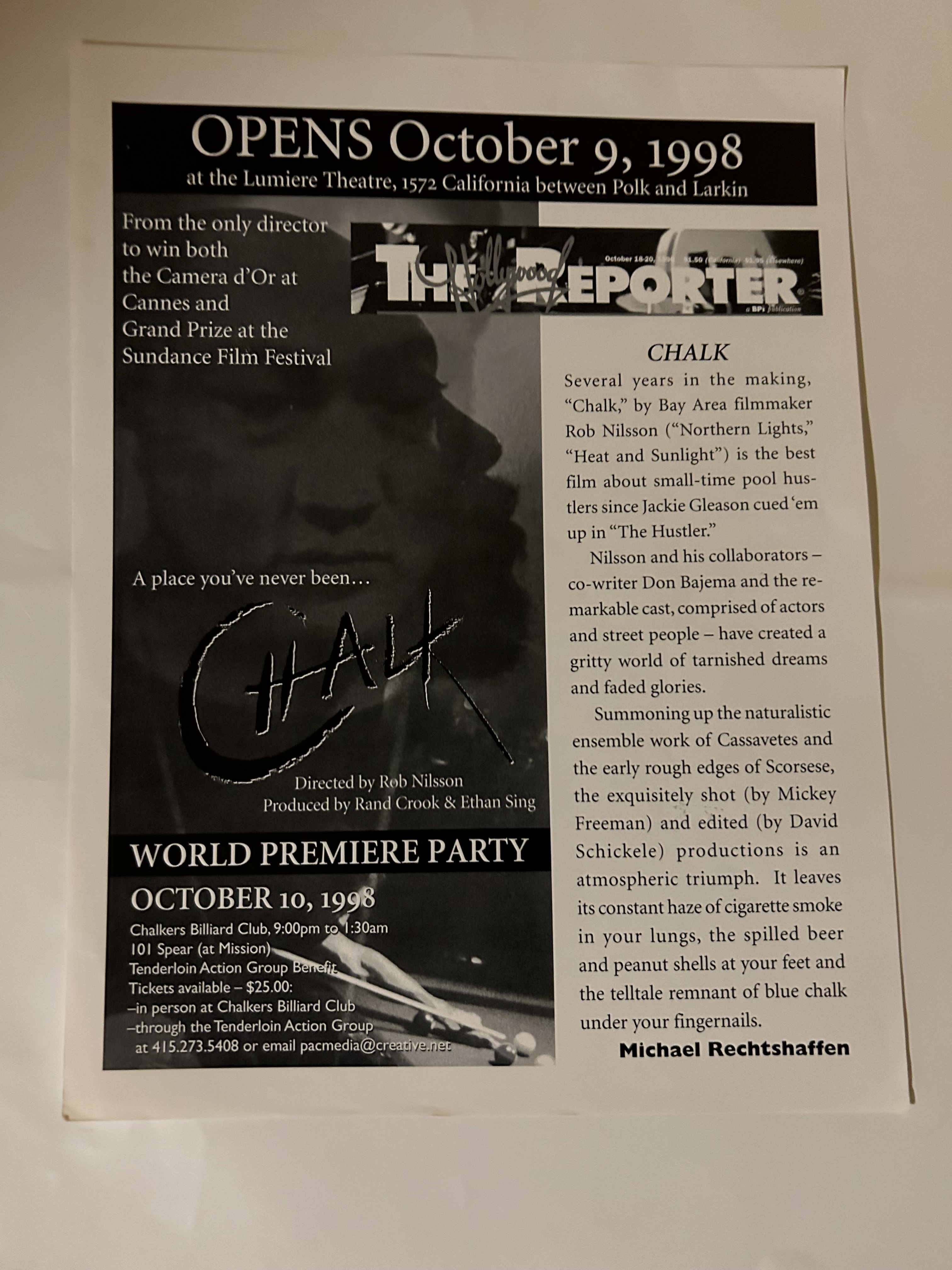 The flyer was a notice that the film Chalk would be playing at the Lumiere Theater in San Francisco, and it was also a notice about a fund raising event for the Tenderloin Action Group at Chalker's Pool Hall in San Francisco.