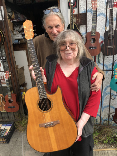 Photo: A 2019 photo of Fatdog (owner of Subway Guitars in Berkeley) with guitarist Lynda Carson (myself) holding a handmade guitar that I built in the guitar workshop of Master Luthier Ervin Somogyi http://www.esomogyi.com during 1985.
