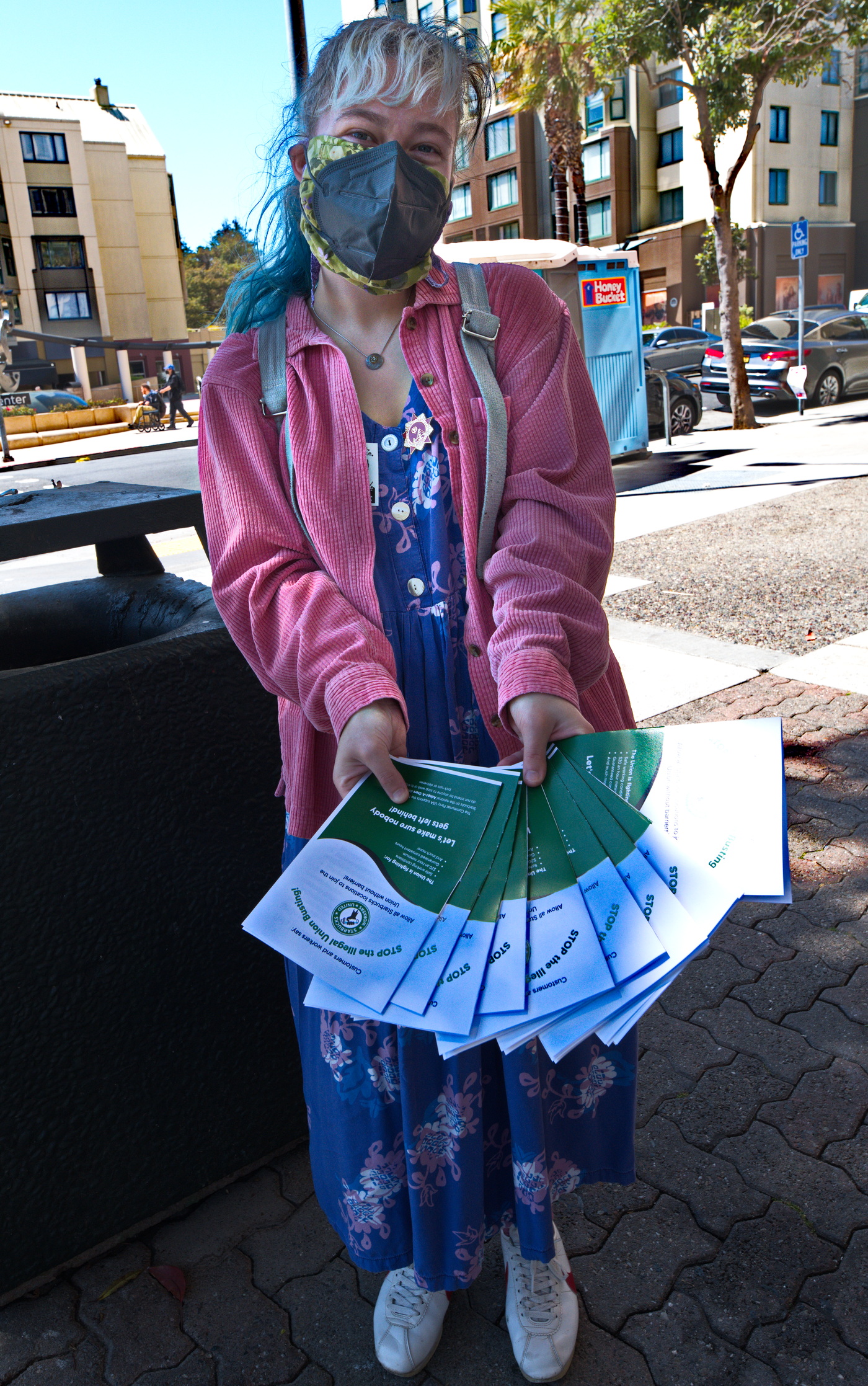 Monday August 7. Leaflets were handed out in front of a Fillmore Starbucks store inviting the public to support efforts by Starbucks Workers United to Unionize the store's workers.