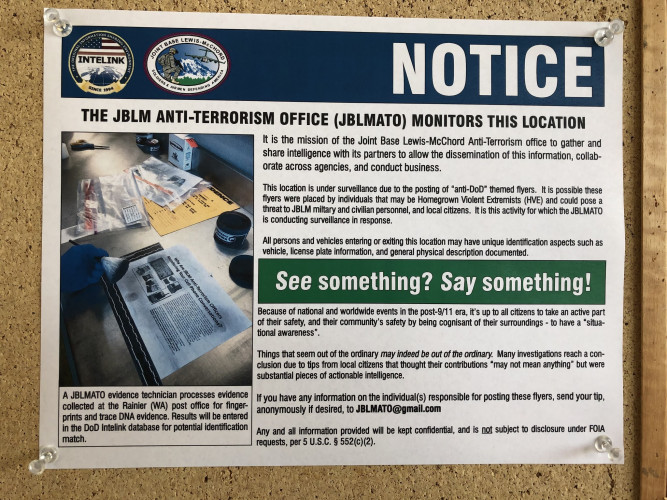 It has come to our attention that the JBLM DES / Provost Marshal's Office / PMO is preventing those seeking help from being able to freely access these support groups. And of even greater concern is that the DES "Protection Division" is attempting to identify individuals who attend recovery support meetings - claiming that these individuals may be a "Threat to Good Order and Discipline" and that a record of their addictions should be identified and kept on file by the JBLM DES / PMO. We have spoken with veterans who are being denied access to counseling and support on JBLM, and we have confirmed from DES personnel that the JBLM ATO is conducting surveillance of recovery support groups, not only on JBLM itself but in the surrounding civilian communities as well. We have seen copies of notices posted in the community, by JBLM, that state "THE JBLM ANTI-TERRORISM OFFICE (JBLMATO) MONITORS THIS LOCATION". (Based on the photo in the JBLM ATO Notice, JBLM is conducting surveillance of civilian communities because community members posted fliers warning that the JBLM ATO was illegally monitoring our cell-phone calls using Stingray electronic surveillance devices.)