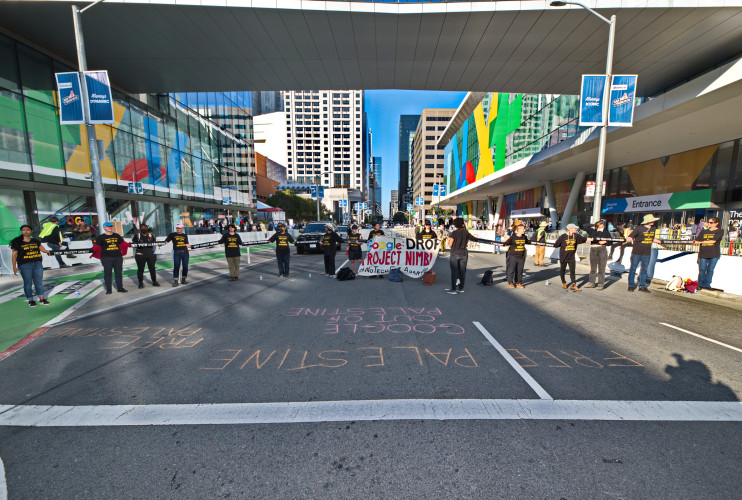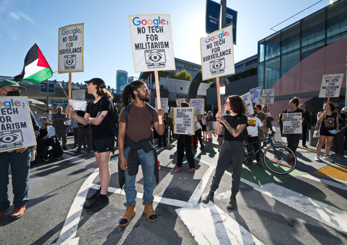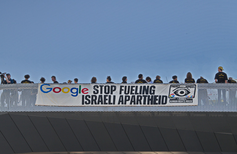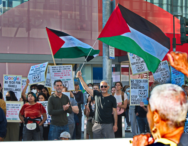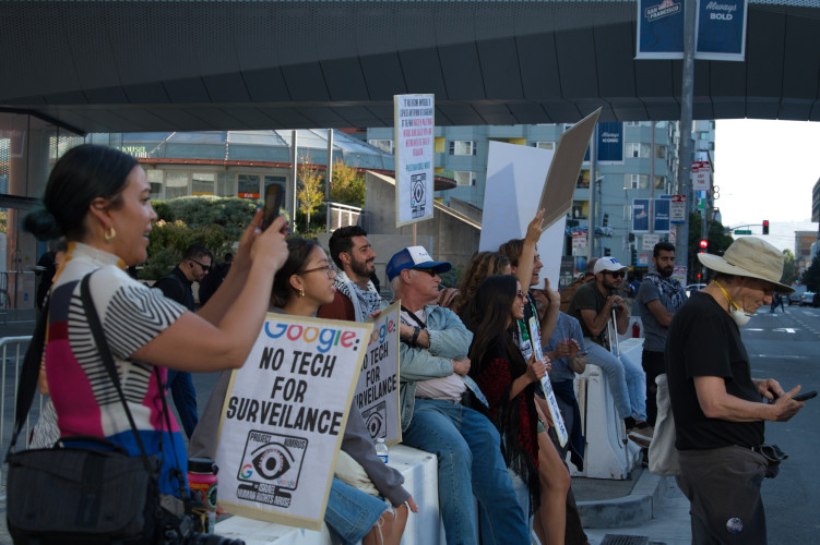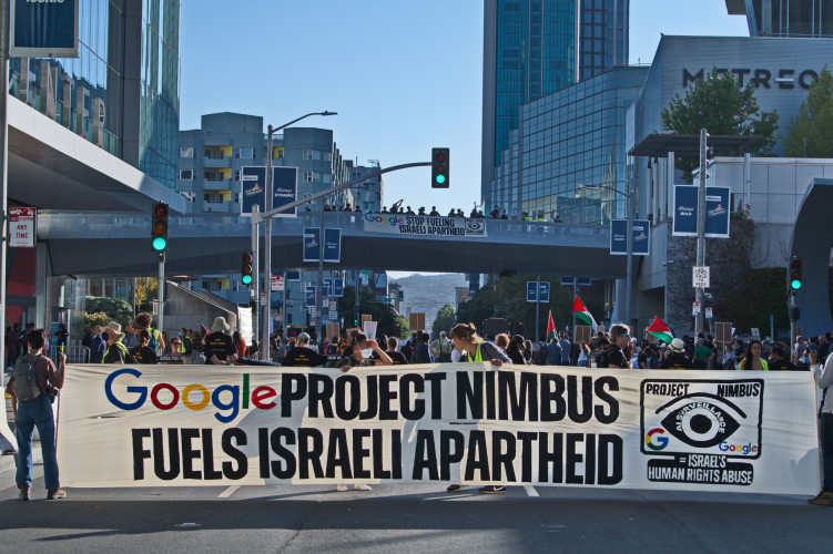 With the slogan "No Tech For Apartheid", hundreds of Google workers and their supporters took to the street in front of the August 29 Google Cloud Next conference. Visitors to the Moscone Center event were met with large banners demanding an end to project Nimbus, Google's billion dollar contract to enhance the Israeli government-military's data gathering on its population (read Palestinian).Hundreds of protesters carried signs saying "No Tech for Israeli Surveillance" and "Drop Project Nimbus." Speakers from many groups including "Jewish Voice for Peace" and mainstream peace organizations made their support known.