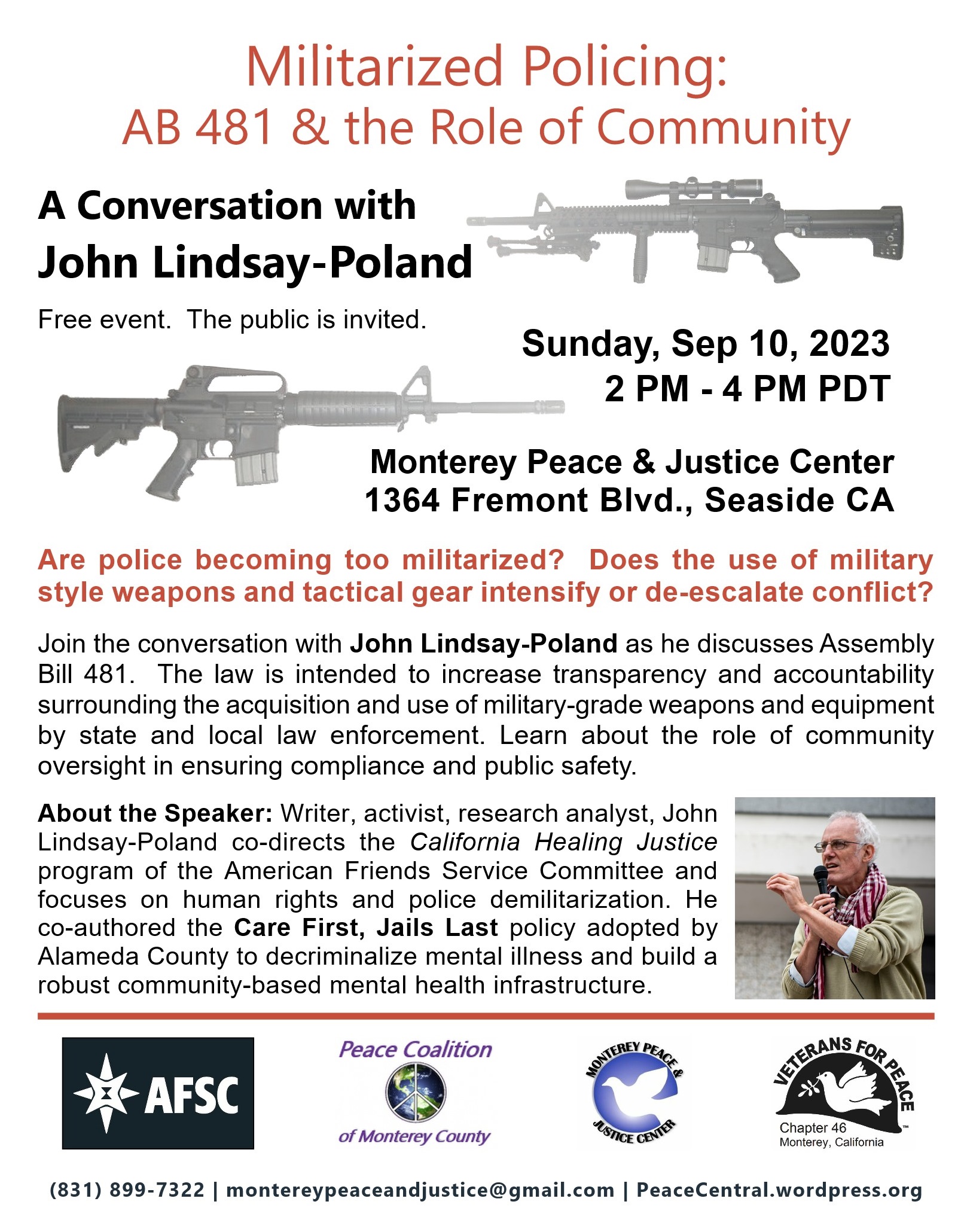John Lindsay-Poland will discuss Assembly Bill 481 (AB 481), a law intended to increase transparency and accountability around the acquisition and use of military-grade weapons and equipment by state and local law enforcement. Learn about the role of community oversight in ensuring compliance. Join the conversation.