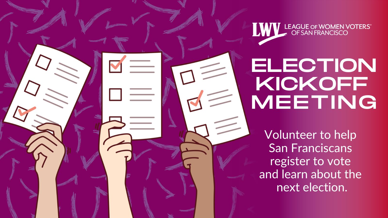 Come to one of our online election kickoff meetings to learn about the different opportunities for volunteering with LWVSF. These includes door-to-door voter registration, youth outreach, candidate forums, ballot recommendations, the Pros & Cons Guide, and more.