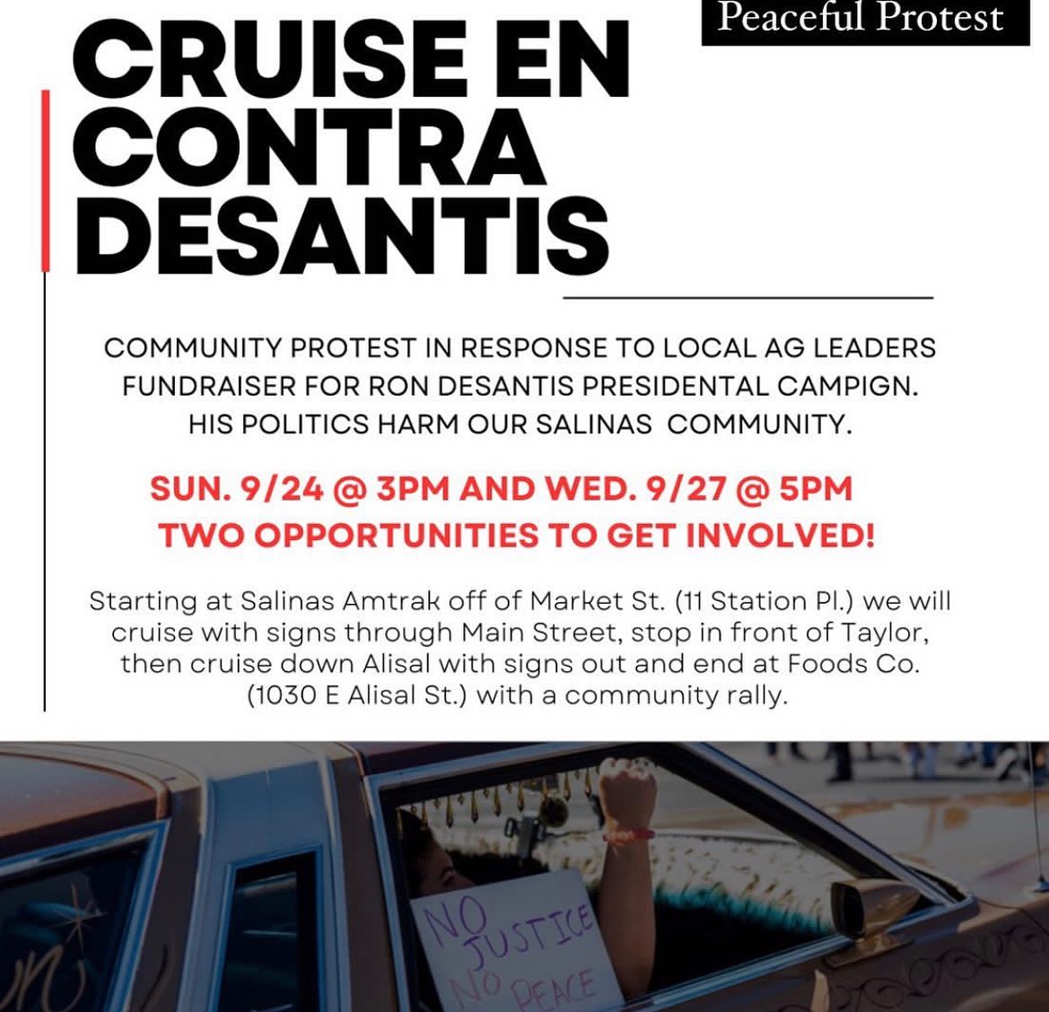 "We stand in solidarity with our larger immigrant and LGBT community in Salinas and are against Ron DeSantis attempts to undermine the values of inclusivity, equality, and social progress. We demand local leadership that prioritizes the needs and well-being of all residents, rather than catering to right wing extremism. Together, we will create a more just and equitable future, free from the destructive influence of Ron DeSantis and his agenda."