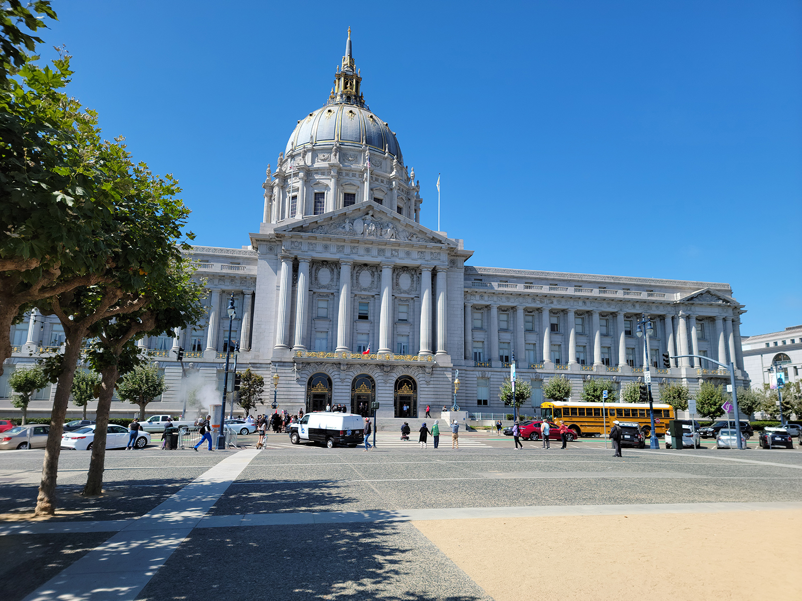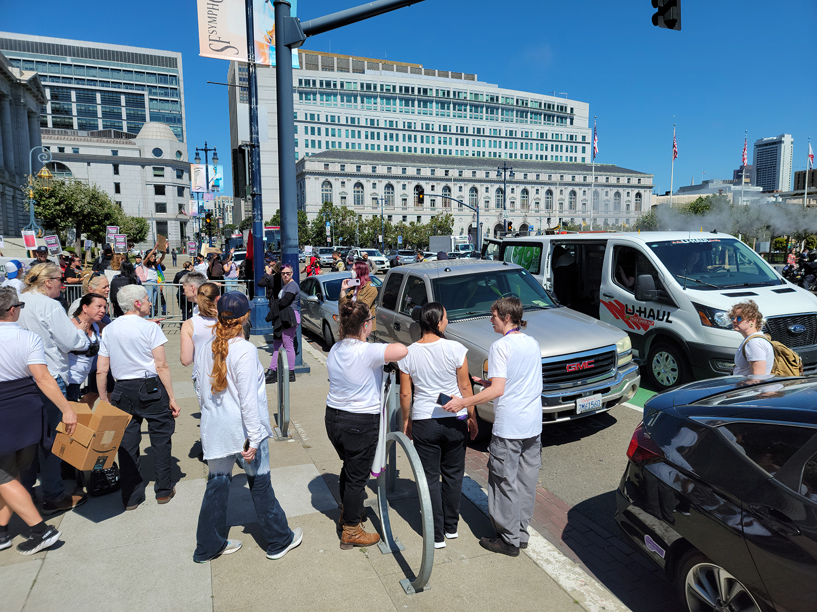 [Photo of San Francisco city hall and the TERF's pipsqueak "direct action." Civic Center Plaza has a long history of being packed with righteous protesters.]