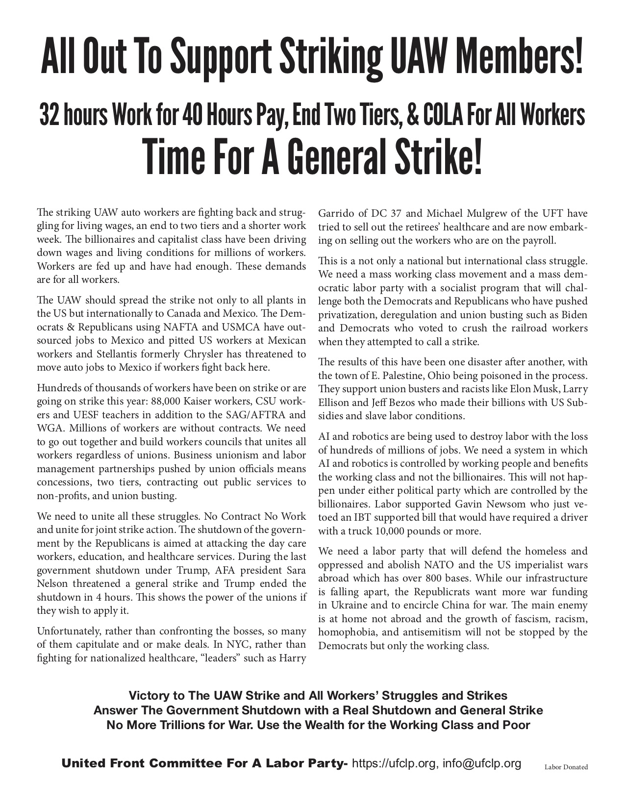 The United Front Committee For A Labor Party UFCCLP supports the demands of the UAW for 32 hours work for 40 hours pay, an end to tiers and a COLA. It also supports uniting the entire working class for a general strike especially connected to the attack on the working class by the government shutdown. It also calls for workers to control and benefit from AI but that requires a mass workers party that will run the country for the working class.