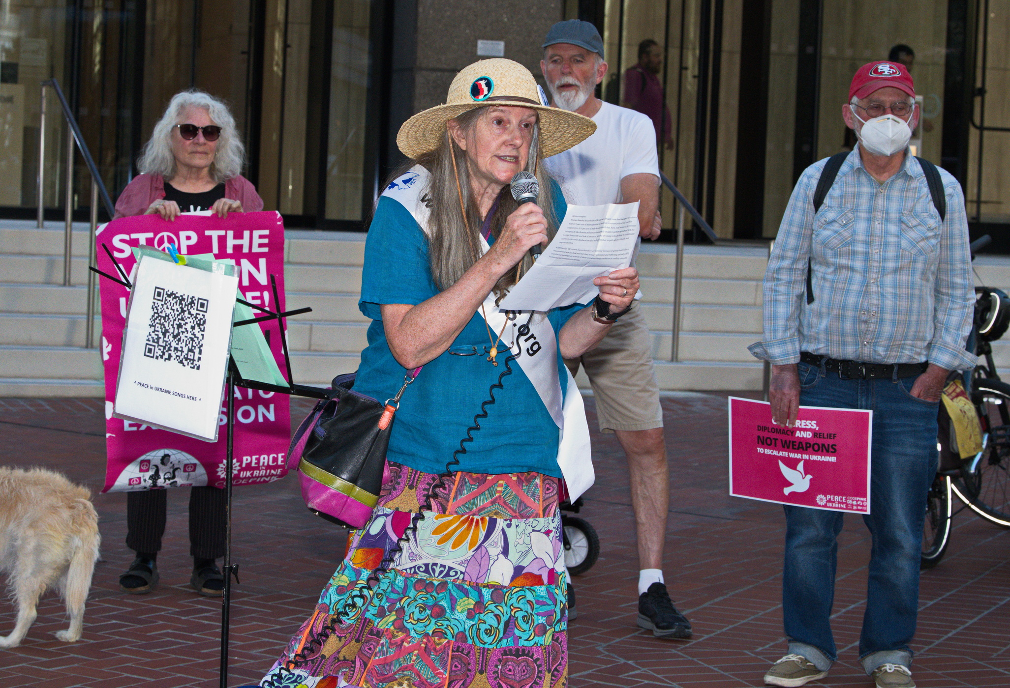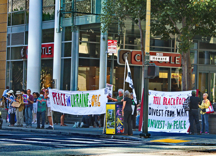 This Thursday, October 4th, those who will not compromise in their repudiation of war intersected those who seek to profit from it in front of BlackRock's San Francisco headquarters. BlackRock profits not only from arms sales to Ukraine but aims to profit from Ukraine's reconstruction at the war's end.Peace activists held signs demanding that BlackRock divest from its investments in "defense" industries, that NATO reverse its expansion , and that Russia get out of Ukraine.
