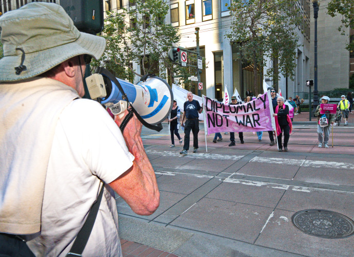 Shouting anti-war slogans, the protesters marched to the Montgomery BART station where others had set up a sound system for a rally. Numerous speakers then blasted the US pursuit of war and apparent disinterest in diplomacy. Fliers were distributed to passers by.