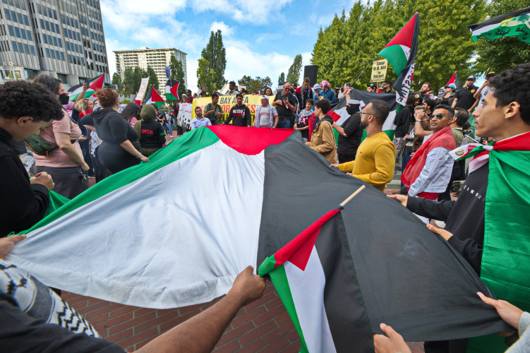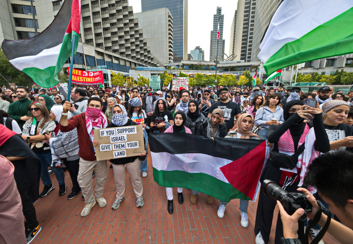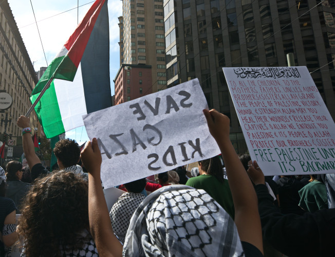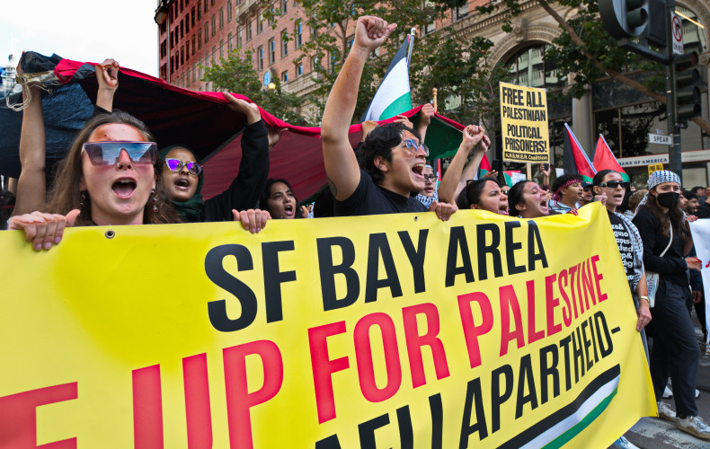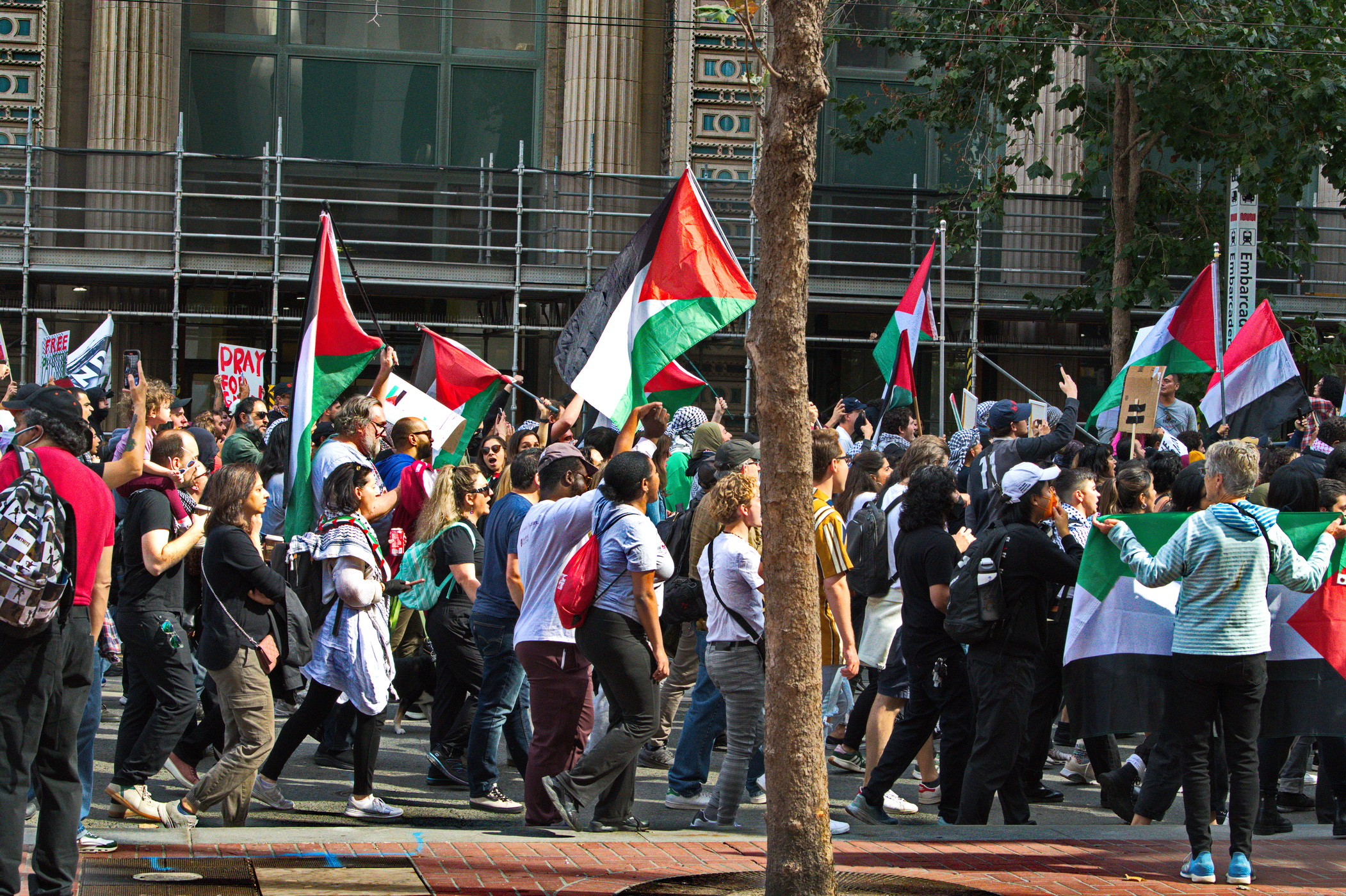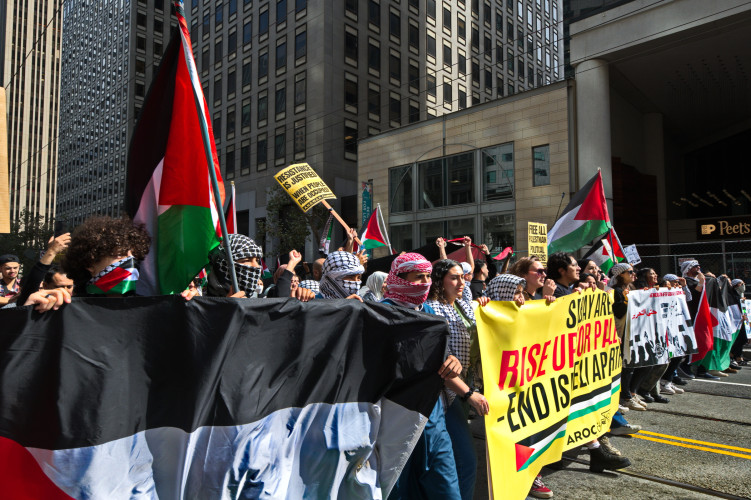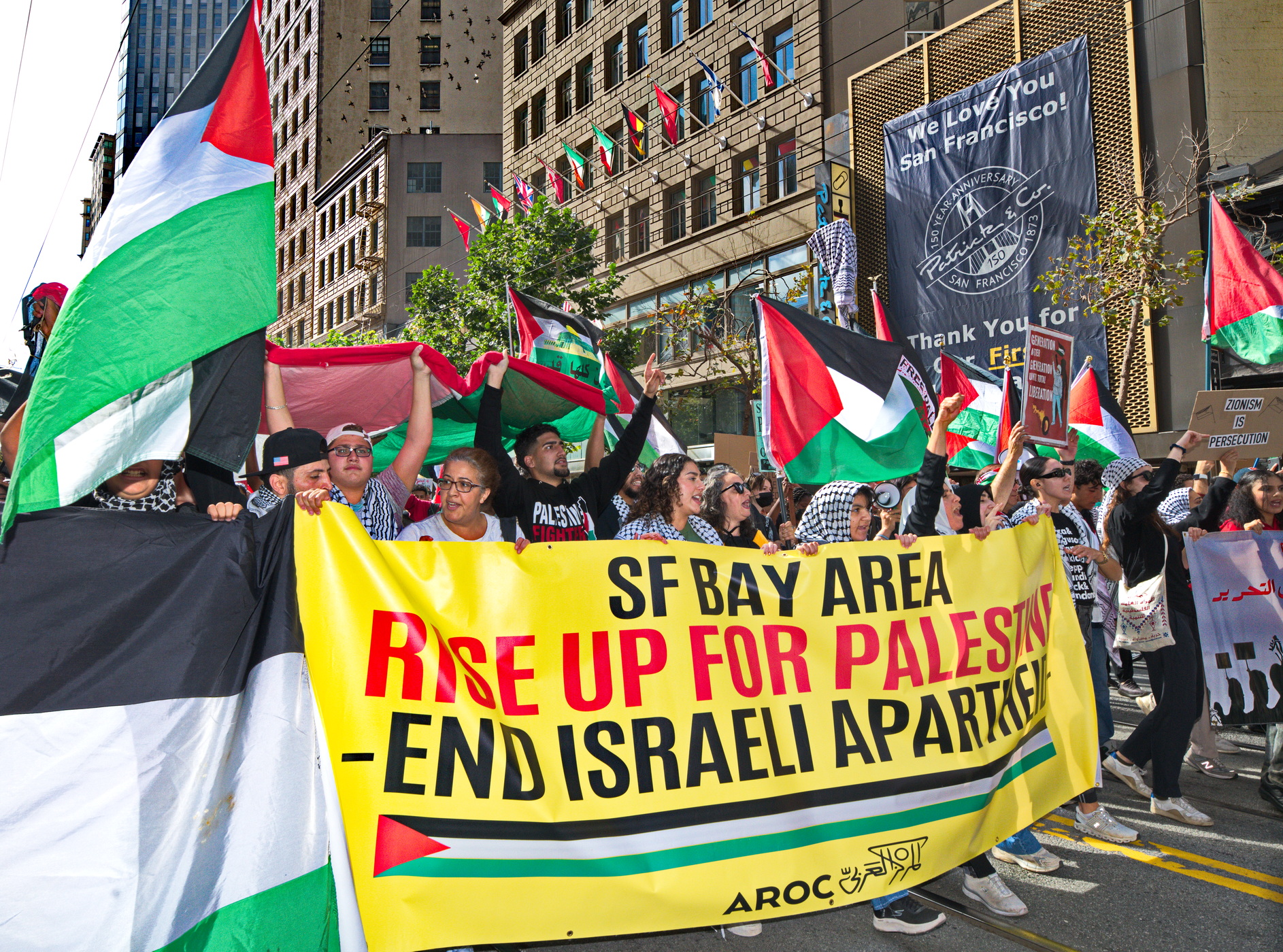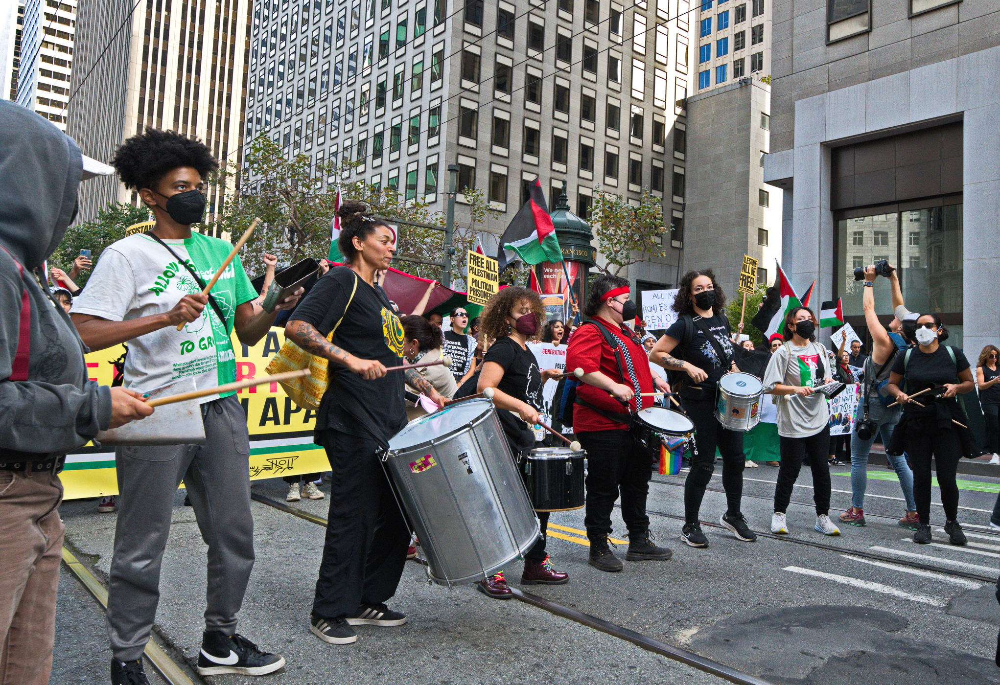On Saturday Oct. 14, San Francisco saw a second demonstration in support of Palestine. At over three thousand people, it was larger than that of the previous week. The action started with a rally at Justin Herman Plaza next the Embarcadero. With intense drumming and many flags, the demonstrators marched down Market Street, looped around, and then returned up Market Street for another rally at Justin Herman Plaza.The Hamas attack caught Israel by surprise, defeating its much vaunted security systems and military and handing the country its most devastating day since its founding in 1948. With the mutual slaughter ongoing, hostility between Palestinians and Israelis has become even more extreme, if possible. "They murdered babies in their cribs" screamed an Israeli. "That's horrible, and do you think that history began last week? Israelis have been murdering and driving Palestinians out of their homes since 1948." replied a Palestinian.