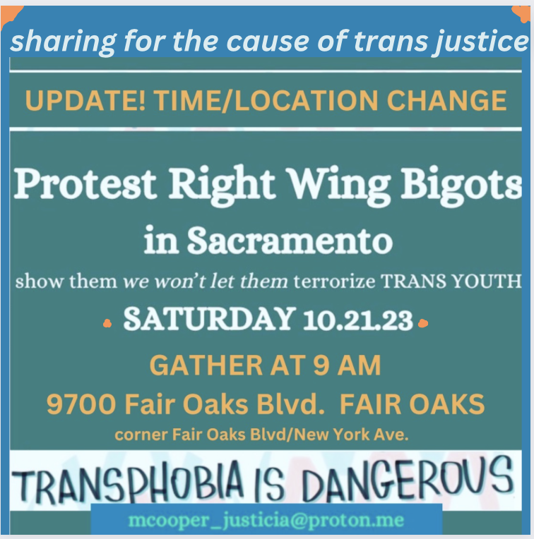 Bigots affiliated with anti-trans groups and national parents’ rights groups are marching to California Governor Gavin Newsom's home on Saturday October 21 as part of a “worldwide” Stop the War on Children rally. Trans rights, reproductive justice and freedom-to-read advocates will counter-protest this right wing extremist event.
