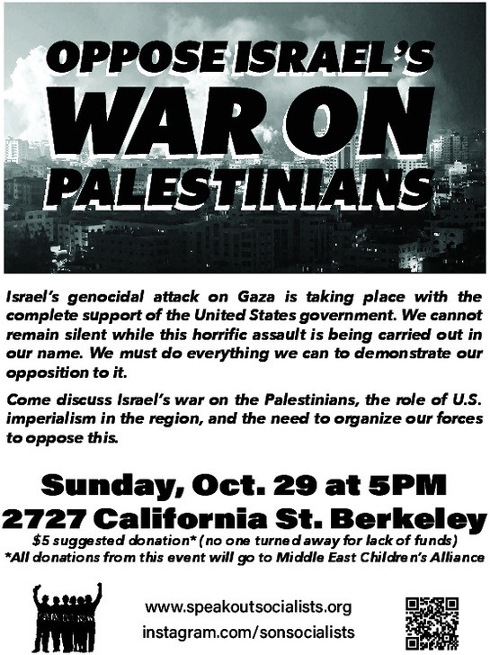 Come discuss Israel’s war on the Palestinians, the role of U.S. imperialism in the region, and the need to organize our forces to oppose this.