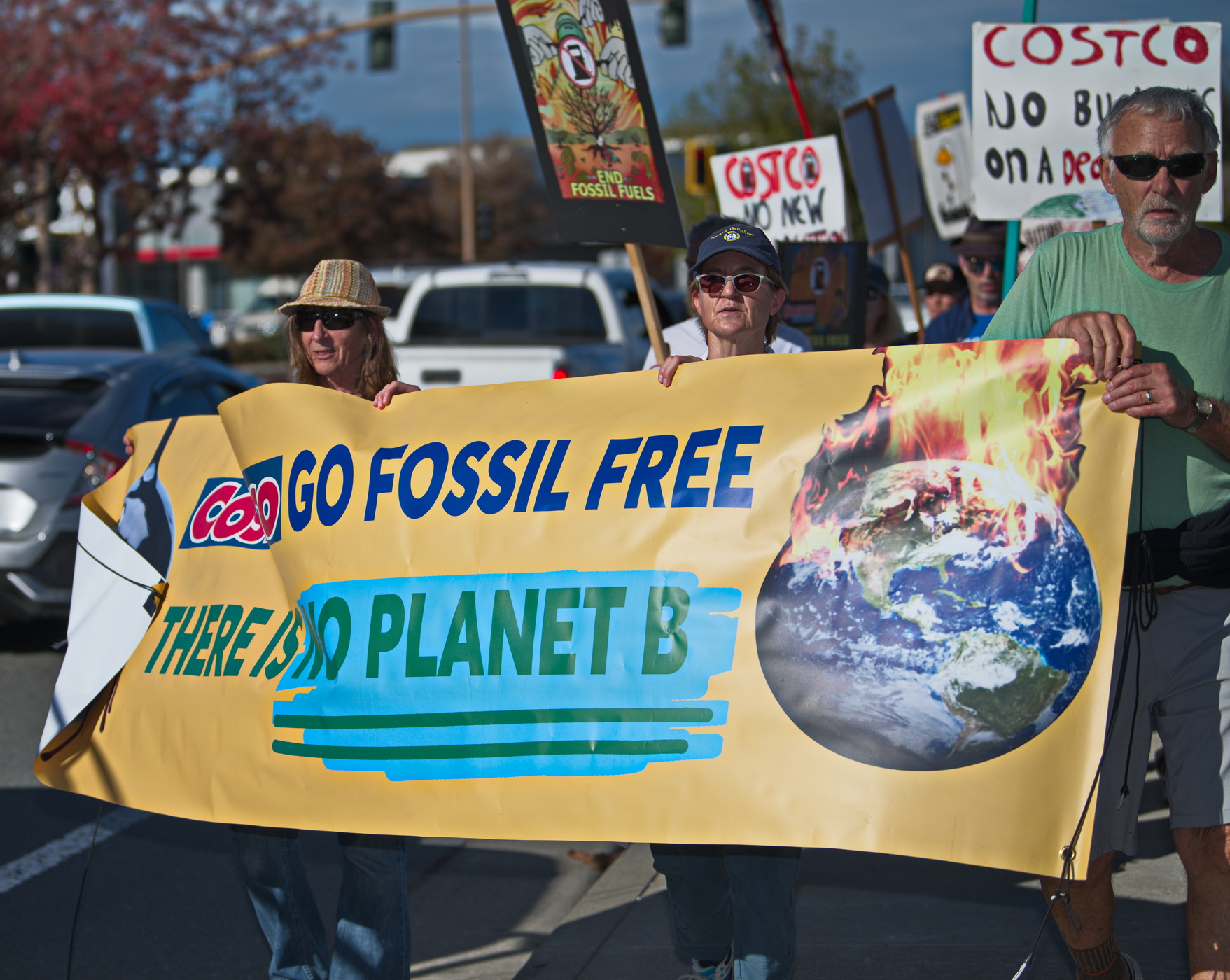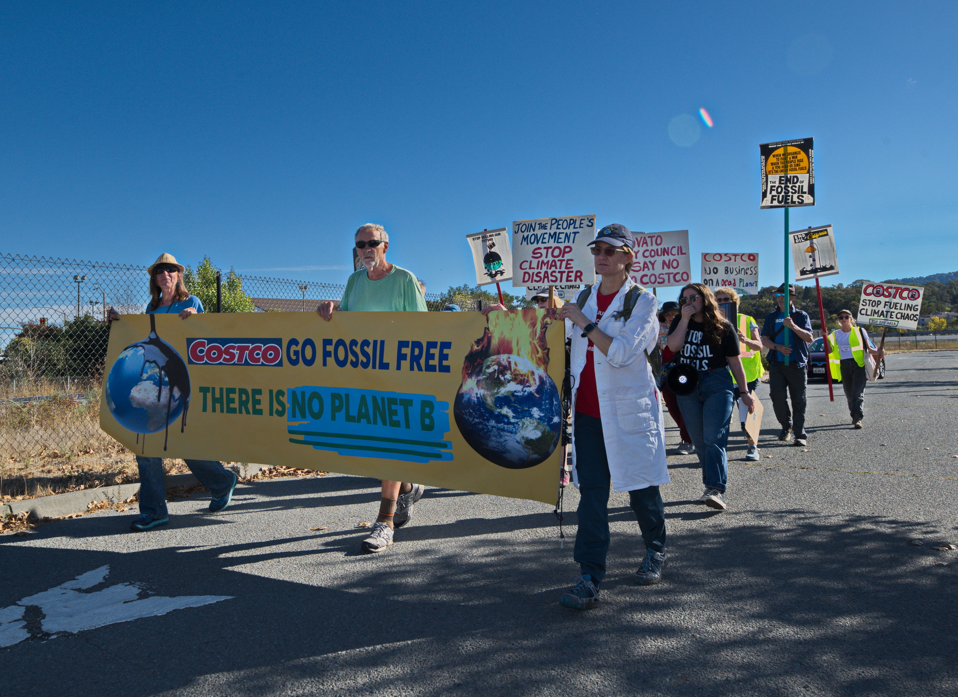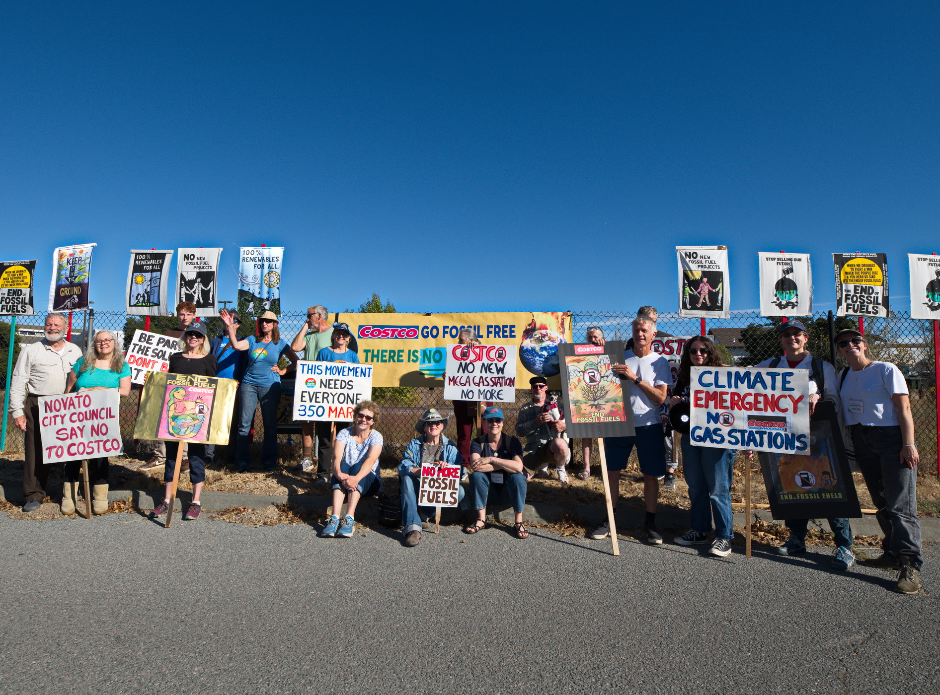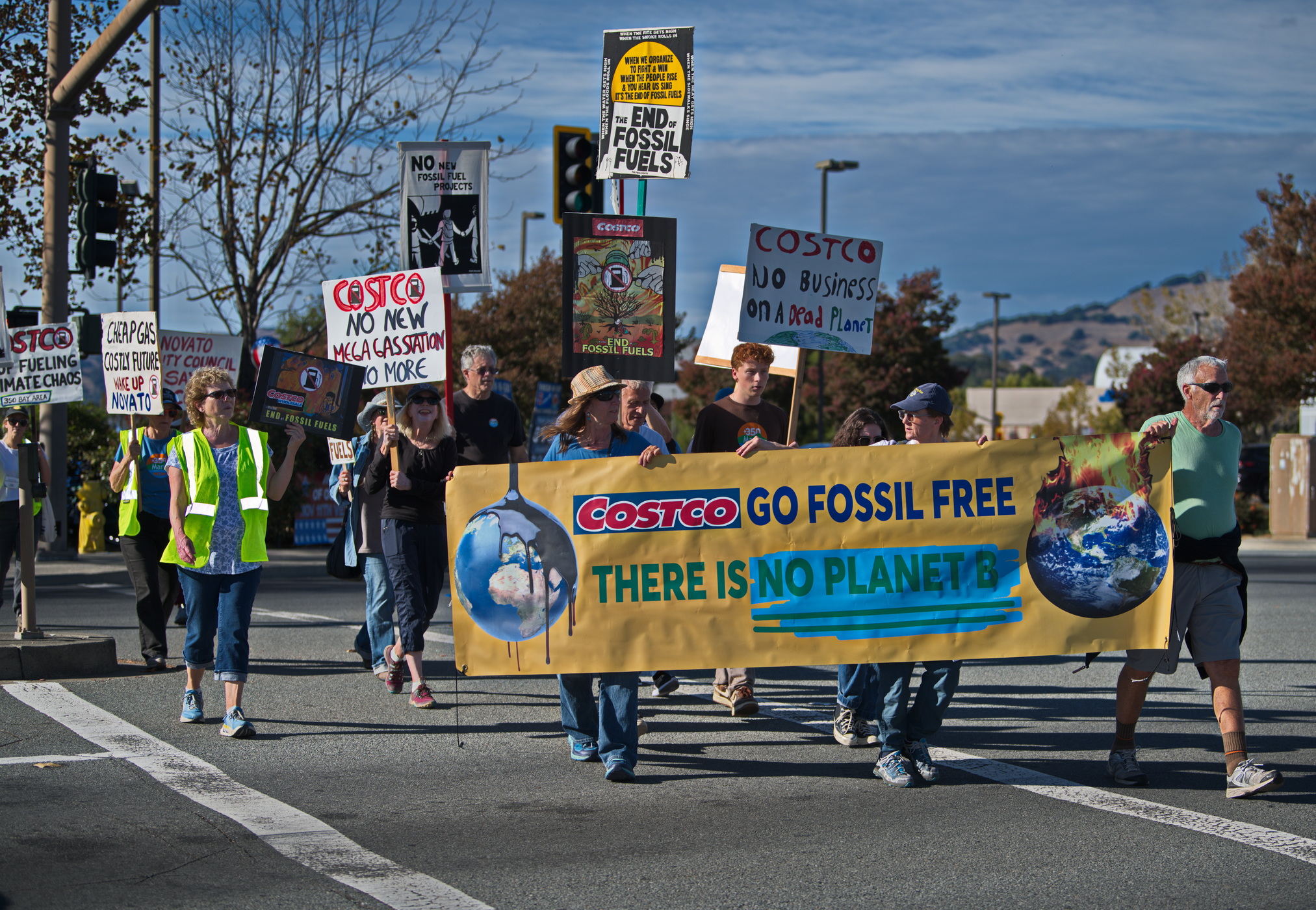 On Saturday November 4th of this climate action weekend, protesters from 350.org and supporters rallied and marched to the Novato Costco with a banner and signs to demonstrate their opposition to an additional large gas station in Marin County.In April 2020, Costco Wholesale proposed to add a gas station adjacent to the existing Costco Wholesale store located in the Vintage Oaks Shopping Center. This was Costco’s second attempt to build a mega gas station next to its store. If approved and built, it would become the largest gas station in Marin County in 2024.