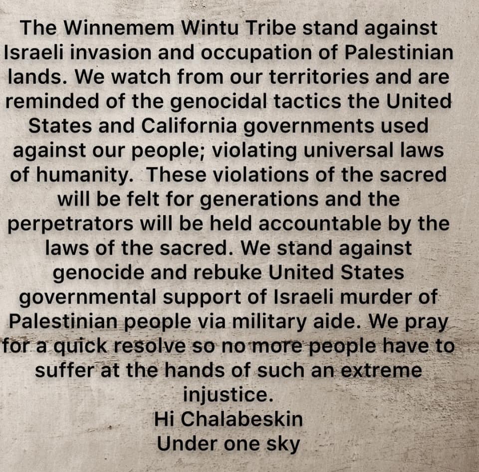 The Winnemem Wintu Tribe stands against the Israeli invasion of Palestinian lands. We watch from our territories and are reminded of the genocidal tactics the United States and California governments used against our people; violating universal laws of humanity. These violations of the sacred will be felt for generations and the perpetrators will be held accountable by the laws of the sacred. We stand against genocide and rebuke United States governmental support of Israeli murder of Palestinian people via military aid. We pray for a quick resolve so no more people have to suffer at the hands of such an extreme injustice.