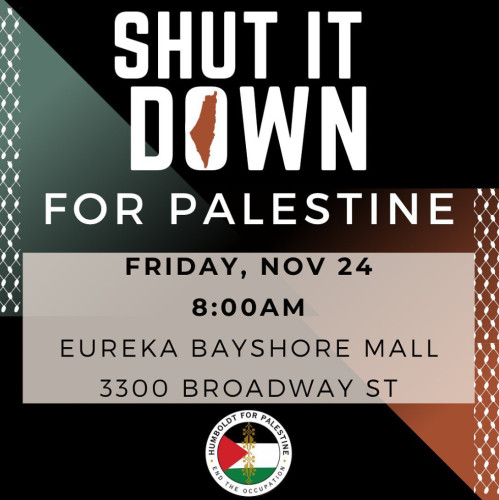 Shut it down for Palestine with us this Friday, November 24th at 8am outside of the Eureka Bayshore Mall. We will meet in front of Big 5 at 8am in the adjacent shopping center and then walk over together to the street light between the lights and the mall.