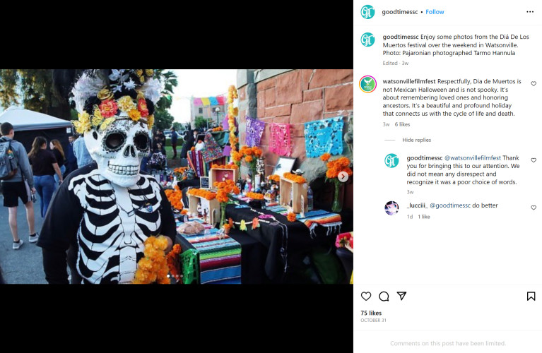 Good Times was called out by Watsonville Film Festival a few weeks ago on Insta for calling Día de los Muertos 'Mexican Halloween'.