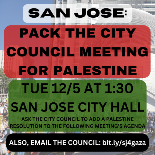 Come to the San Jose City Council meeting on Tuesday December 5 at 1:30pm to ask the Council to add a Palestine resolution to their next meeting agenda. Also, email the City Council with the same request: http://bit.ly/sj4gaza