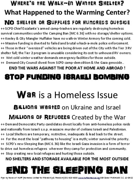 HUFF (Homeless United for Friendship & Freedom) is concerned with the impact of continuing gentrification downtown, police attacks on the homeless, and the general criminalization of the poor. We are also united in our opposition to the Gaza bombing, and City Council support for or neutrality towards the massive U.S. spending for Israel and Ukraine.