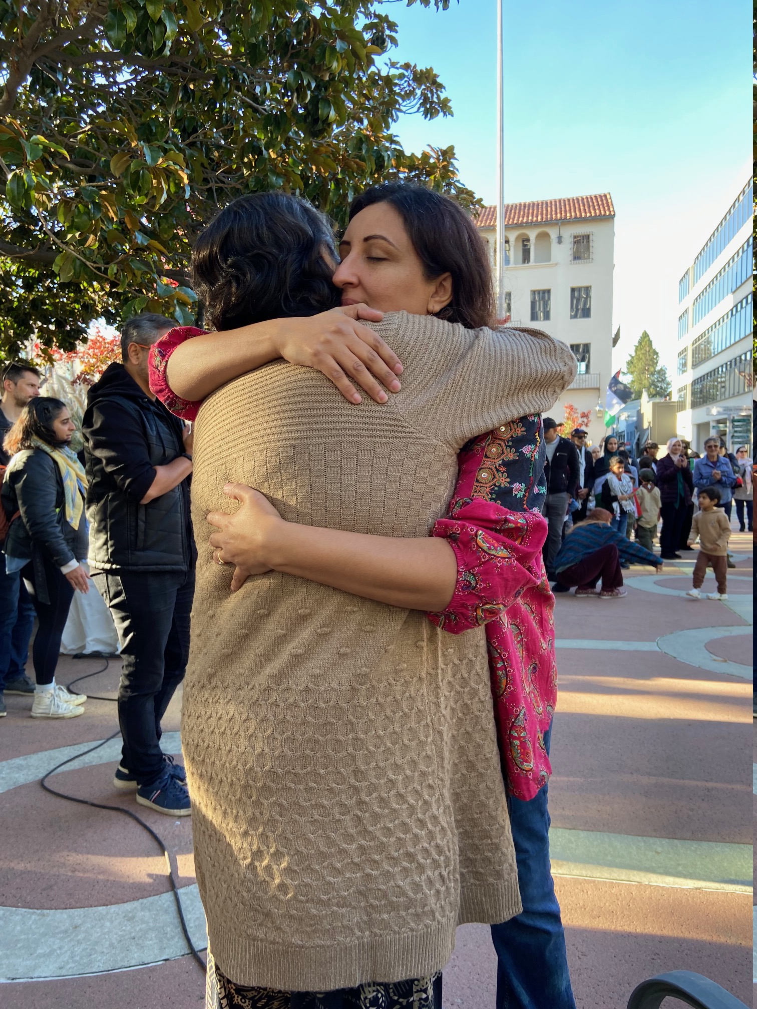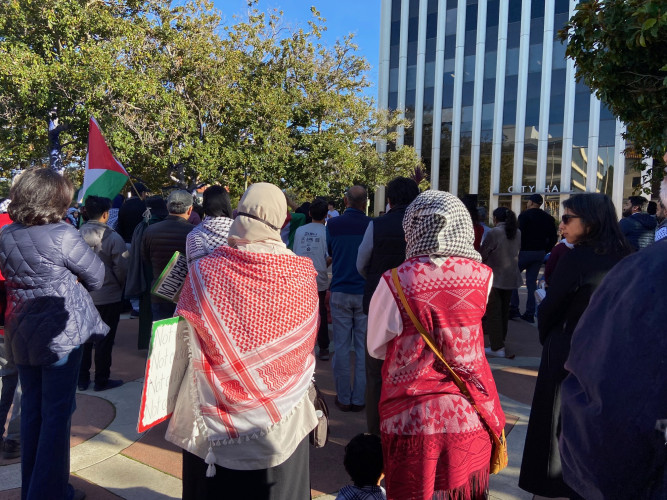 Speakers included representatives from AAPI Youth Rising, Salaam Shalom Sisterhood, Haiti Action Committee, CAIR San Francisco, and Jewish Voice for Peace-South Bay. There were peace songs including one calling out weapons manufacturer Lockheed Martin located nearby in Palo Alto's Stanford Research Park.