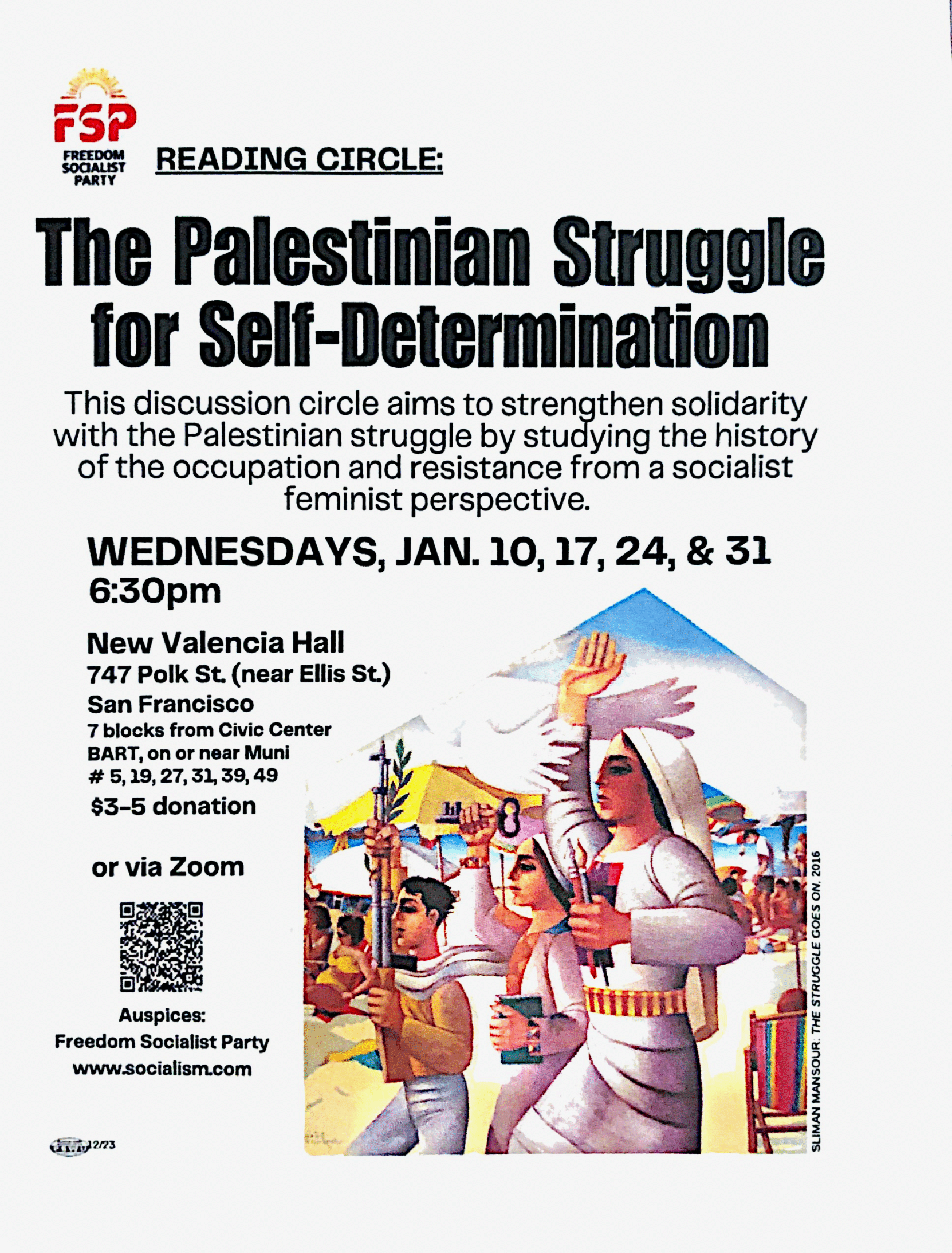 Short readings will cover the history of Zionism, Palestinian resistance, debates and divisions within the Palestinian leadership, and how U.S. activists can best help the fight to free Palestine.