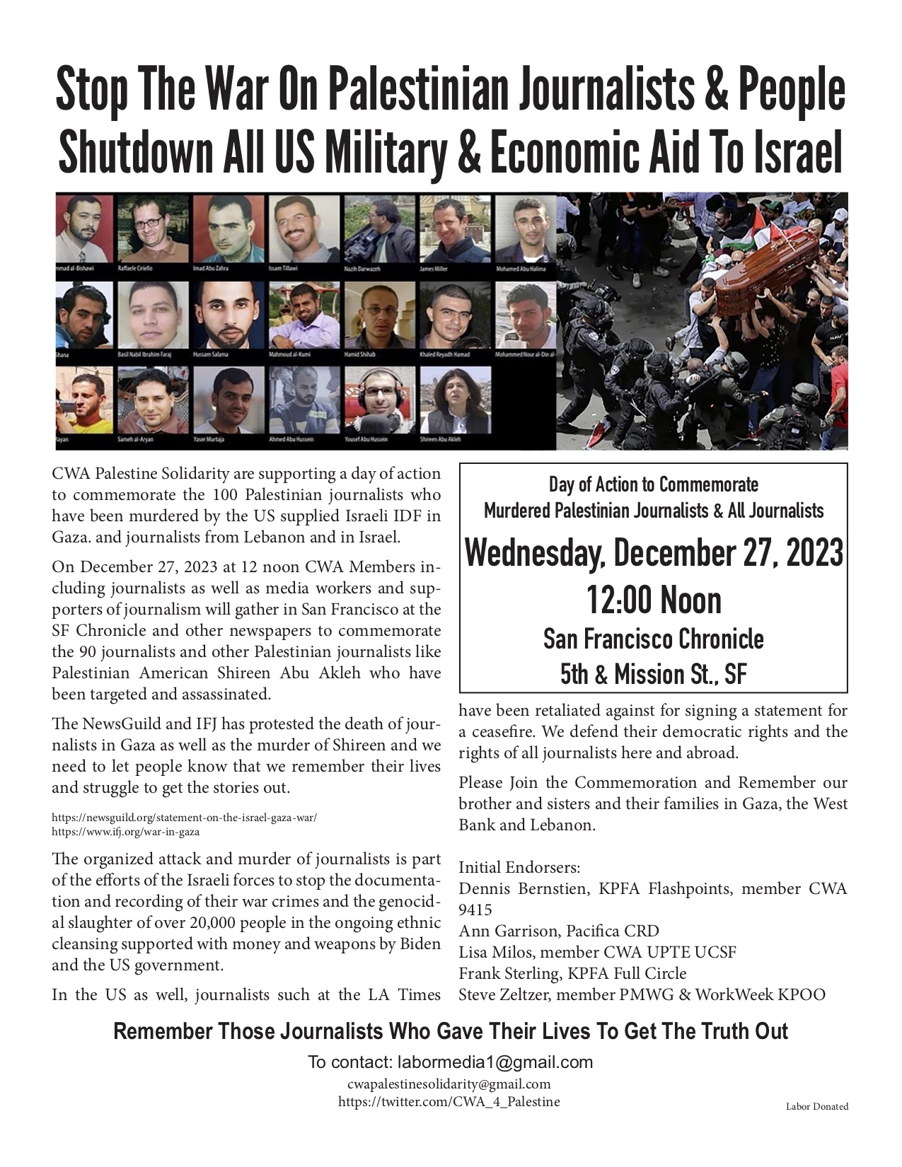 On December 27, 2023 at 12 noon CWA Members including journalists as well as media workers and supporters of journalism will gather in San Francisco at the SF Chronicle and other newspapers to commemorate the 100 journalists and other Palestinian journalists like Palestinian American Shireen Abu Akleh who have been targeted and assassinated.