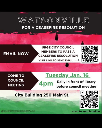 Join Watsonville community members at the city council meeting on Jan 16 to PACK THE CHAMBERS! Let’s show our council that this is URGENT and we want a CEASEFIRE NOW. A ceasefire resolution needs 4 votes to pass. Passing a resolution will help build momentum regionally and nationwide as we join millions across the globe calling for a Ceasefire in Gaza! Please encourage friends and family members to join—we want Watsonville to be on the right side of history!