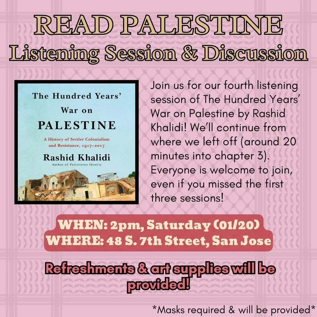 We’ll be continuing our Read Palestine listening sessions of The Hundred Years' War on Palestine where we left off (~ 20 minutes into chapter 3) at 2pm this Saturday (01/20) at the San Jose Peace & Justice Center. Everyone is welcome to join, even if you missed the other sessions! Refreshments and art supplies will be provided!