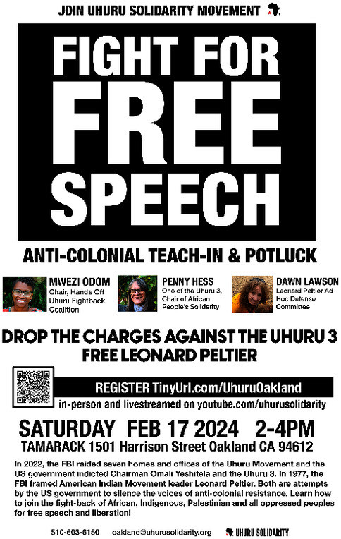 Come to learn and to join the fight-back of African, Indigenous, Palestinian and all oppressed peoples for free speech and liberation! Free and open to the public. The event is both in person and also will be streamed live at https://www.youtube.com/@UhuruSolidarity