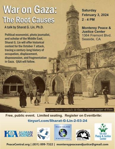 Sharat G. Lin will offer historical context for the October 7 attack, tracing a century-long history of occupation, displacement, dispossession, and fragmentation in Gaza. Q-and-A will follow. Join us for this in-person event at the Monterey Peace and Justice Center.