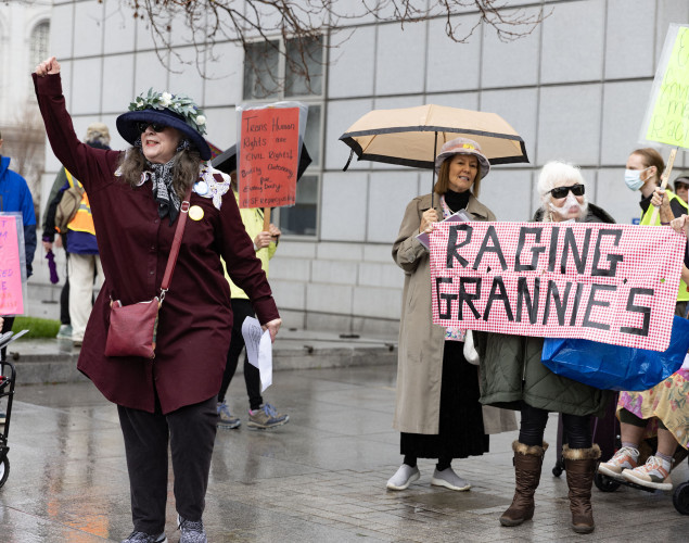 Rain couldn't stop the Raging Grannies. Blustery weather couldn't stop Brass Liberation Orchestra. Both groups have been active in the Bay Area for more than 2 decades. Finally a chance to perform together...this time for reproductive justice at the San Francisco Public Library on January 20, 2024. Rally and speakout against so called "pro-life" marchers.